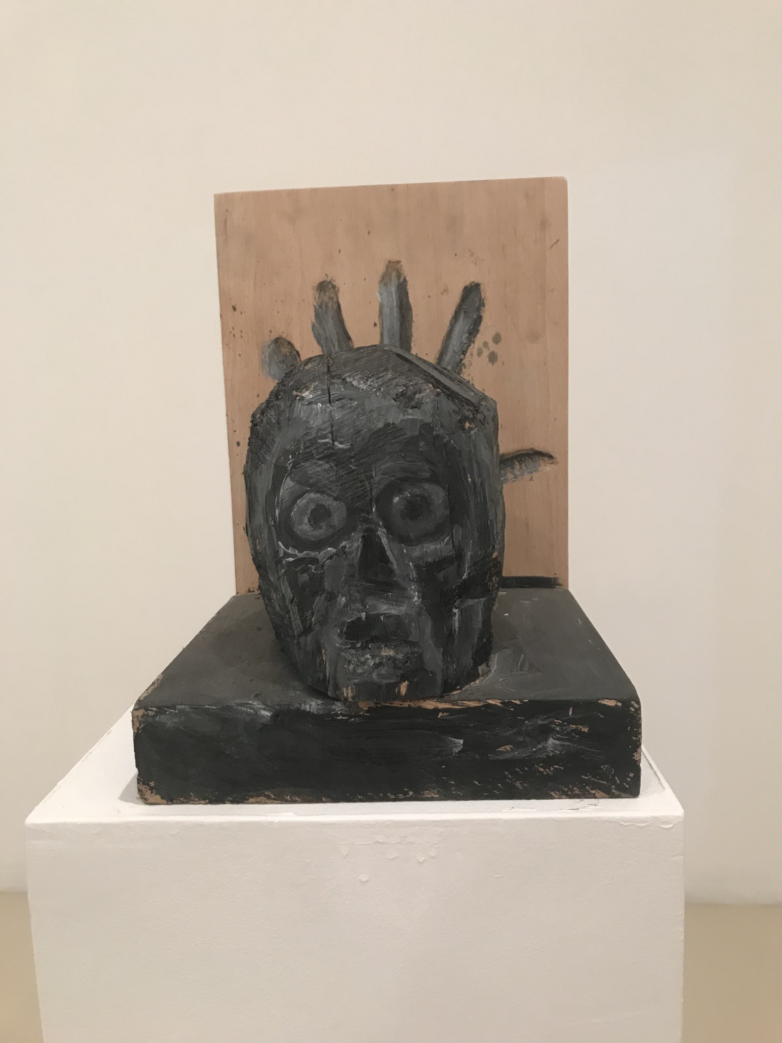 When Lellouche isolates the head and hand, the religious association becomes stronger. The head, a central motif in Lellouche’s oeuvre, is treated differently from in his other works. A small head in black becomes a mask of anxiety bringing to mind Munch, or Oceanic or African sculpture (which inspired modern artists). Lellouche places the head in front of a painting of an open palm, looking like a crown or perhaps a hand that struck a mortal blow. The disconnect and the severance are threatening.