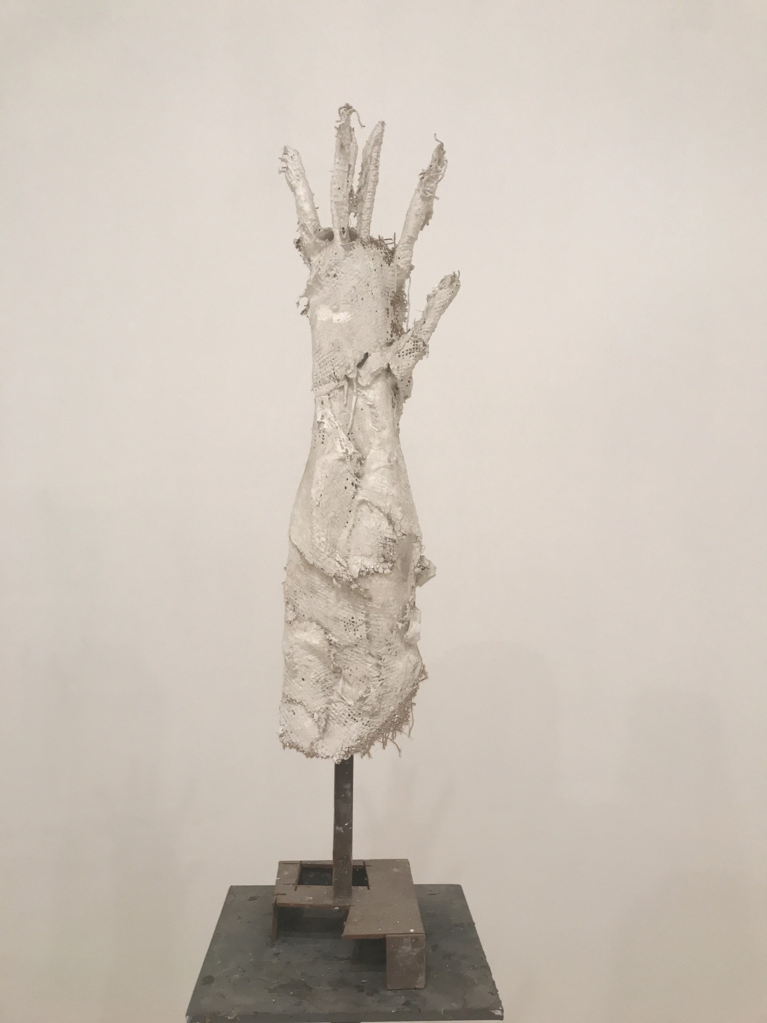 זרוע משופדת על מוט מתכת, יצוקה בקרעים שמעלים על הדעת יריעות גבס מגבירה את ההרגשה של צפייה בשרידי לוחמה מזוויעים, בהתעללות , במה שלא ניתן לעמוד בו. ללוש מקפיא את כל אלו, מהלך על חוט הדמיון המשוך בין זוועות לבין הדרך בה נראות רליקוויות, שרידי קדושים שמציגות איברים קטועים מחומרים יקרים שממסכים את המחשבה על בשר, ונפש, שסועים.