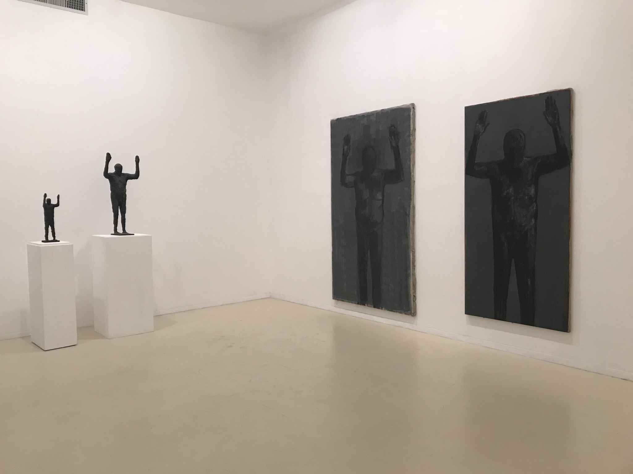 Ofer Lellouche ponders death in this well-considered, precise exhibit, in memory of his assistant Dan Bergstein. The exhibit makes present an in-depth contemplation of a phenomenon which can never be grasped although it affects every living being. It is espacially intriguing in the context of Israeli sculpture which is,to a great extant the history of memorial statuary . Lellouche explores and deconstructs the image of a male figure with his arms raised. The image is timeless, or atemporal, and the gesture can be easily deciphered. Despite its familiarity, the image is a crossroads of cultural assumptions from various historical eras, so that the exhibit is about analyzing the reading of the image no less than about the image itself.