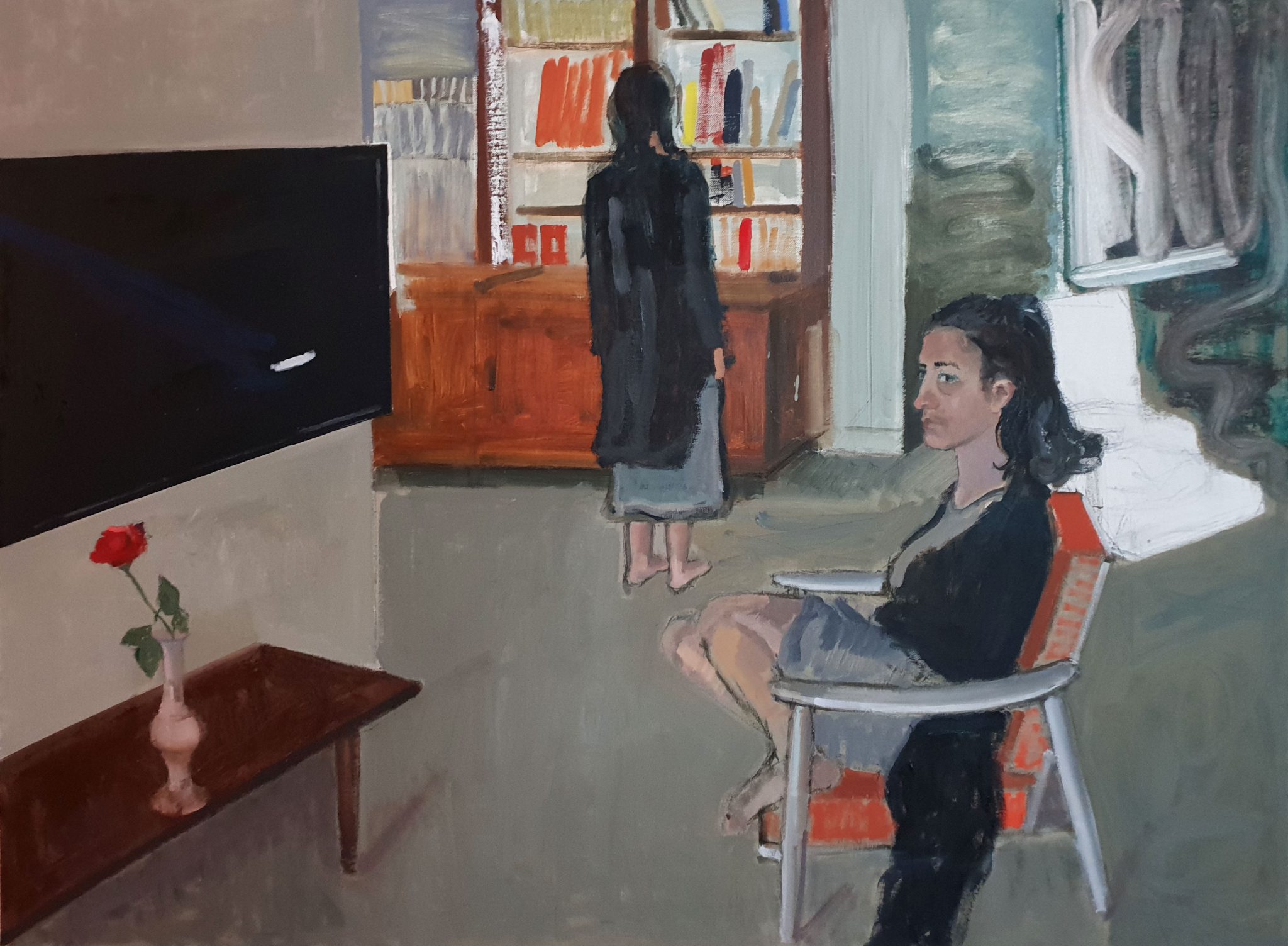 מיכל ביבר מציגה מבחר מתוך גוף עבודות שנוצר בשנתיים האחרונות, בעקבות משבר הפליטים באירופה. הטריגר ליצירת גוף עבודות זה היה תכנית טלוויזיה שעסקה בפליטים המנסים לחצות את הים בסירות, בדרכם ליעד המיוחל. העבודות מאוכלסות בדימויים מן התקשורת, הכתובה והמשודרת. הדימויים המתווכים האלה, חלקם בפורמט טלוויזיוני, מתורגמים לציור שלעיתים ממלא את הבד ולעיתים “שתול” בתוך סצנה ביתית. ג’אנר התפנים (Interior) בציור, המייצג בדרך כלל את המרחב הביתי, המזוהה עם התכנסות ואינטימיות, מתחבר כאן באופן מרתק עם ציור חברתי/פוליטי, כזה העוסק בהיבטים אוניברסליים ודילמות מוסריות.
