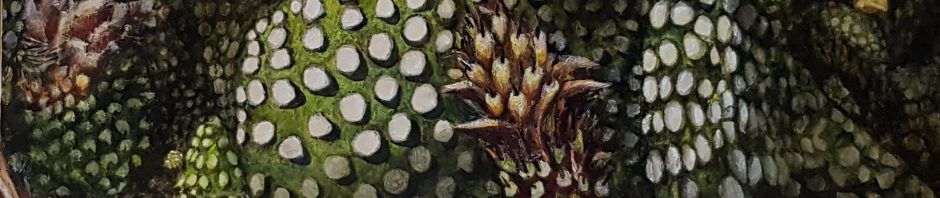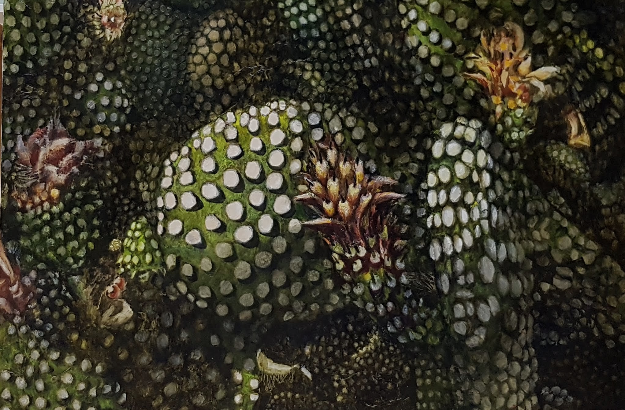 משנשבר המחסום עולם חדש ומסעיר נגלה לעיני הציירת שלי, עולם צורני ,משורטט בדייקנות , גיאומטריה מושלמת ,פרקטלים, ספירלות , משושים, מתומנים ,עמודים משולשים , צבעים וטקסטורות. לפתע נגלו לעיני יופיים , ייחודם , אופיים יוצא הדופן, ויכולתם להיות כה מגוונים ובה-בעת חסכניים ומינימליסטים. נשבתי בקיסמם , נמלאתי השתוקקות וזאת , מבלי ששתיתי פיוטה ואייווסקה בטקסים אינדיאנים . הם יצרו בדמיוני גופים שמימיים, גלקסיות ללא שם שטות בשמיים שחורים , רשתות עצביות, רשתות חברתיות, יצורים קדמוניים זחלו אלי כסרטני ענק בעלי משושים מגששים את דרכם בקוציהם. ראיתי דרכם עליתן ונפילתן של אימפריות, רק בעודי מציירתם אותם משתוממת איך בסבלנות אין קץ , מקוץ לקוץ , יוצרים מארג ביולוגי ,גיאומטרי ,פראי וכאוטי . התוכנה מקודדת ומודגמת בצורה כל כך ישירה בסידור קוציו של הצמח הזה. בפשטות, זה נגע בי והניע אצלי צורך להתמקד בם , ותוך כדי שאורגת אותם גם נארגת בהם , והייתי כחלק , חלקיק , חווה את קיומי , כי בהיותי מדברת על מורכבות המבנה , אני מדברת על האינטליגנציה שעומדת מאחורי כל זה.