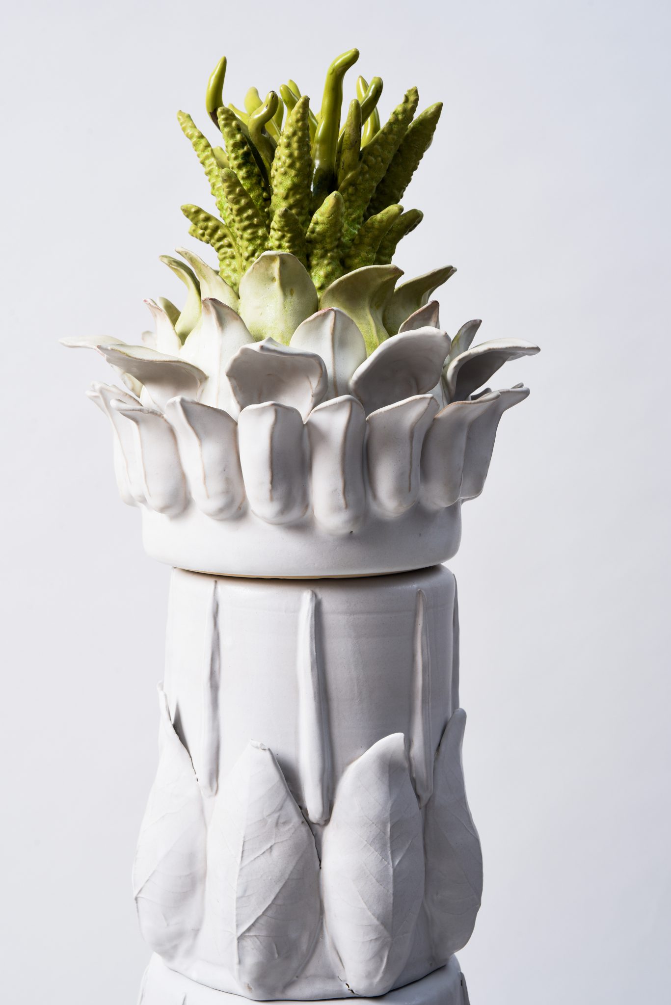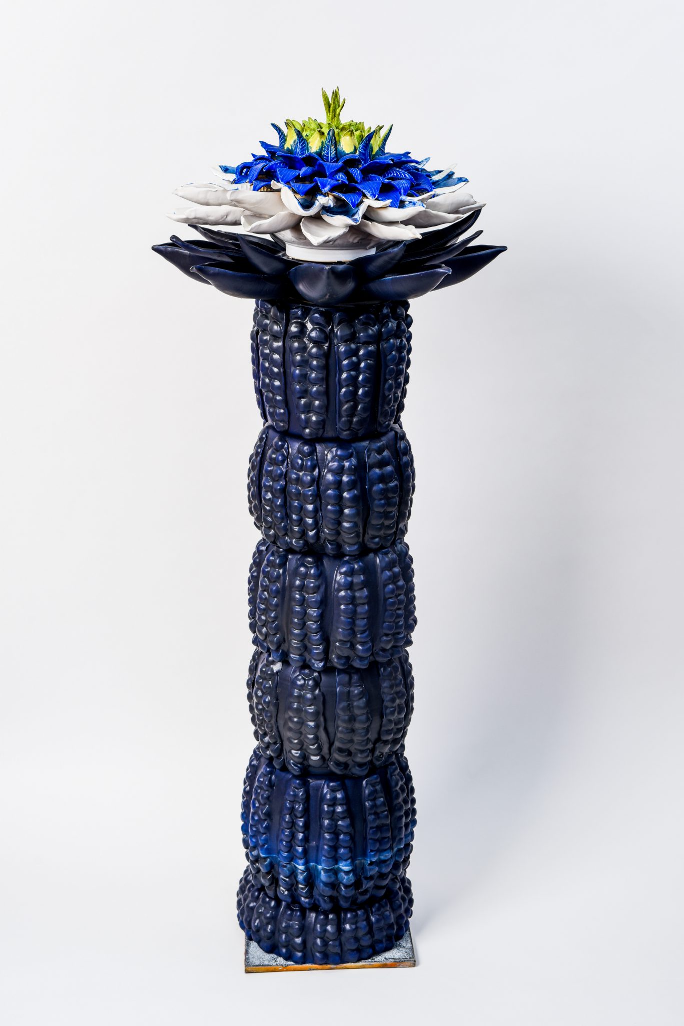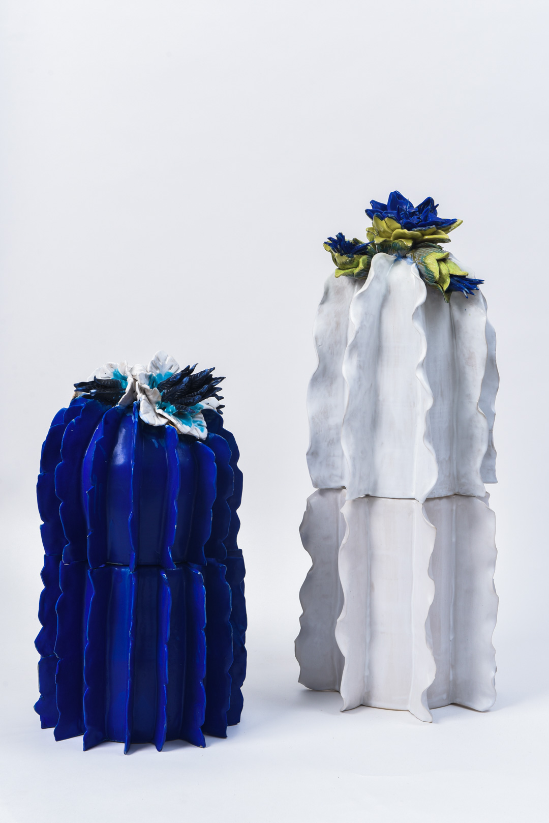 סדרת העבודות “הצומחת כלפי מטה” בנויה משילוב של גופי חומר לצד חלקים מטקסטיל. האובייקטים נידמים לצמחיית פרחים אקזוטיים בעלי לשונות ארוכים, קנוקנות משתלשלות ומתפתלות מן התקרה מטה. החיבור בין החומר הקשה לרך יוצר מיחבר אמורפי המזכיר גם דימויים וגטטיביים, ספק אלמוגיים, ספק צמחים טרופיים.