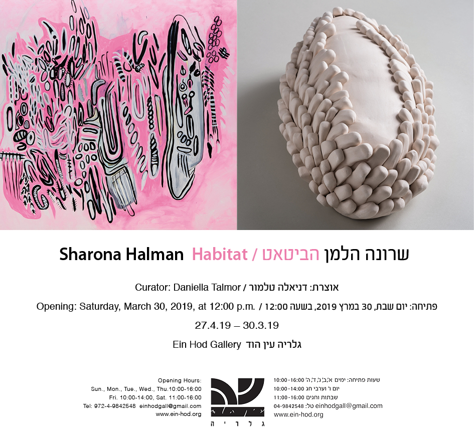 Sculpture in clay and porcelain is the dominant medium in Halman’s work in recent years and her sculptures complement the body of her painting and drawing work that she created in the past. Sculpture serves her as a “habitat,” a home, an environment that enables life. Halman examines the work ensconced inside the material and “raises” it out from within. The first work she created in the series “Habitat” was a kind of tuber, an elongated, defenseless and vulnerable egg around which the enveloping protective layer began to take shape.