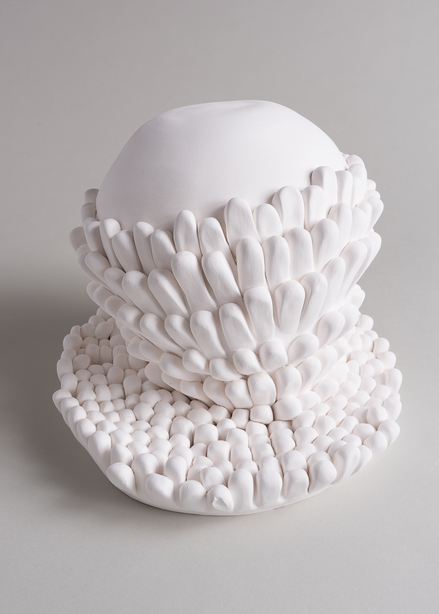 Elements that make up Halman’s arid white sculpting induce the viewer to touch the exhibits. The scales decorating her porcelain sculptures are reminiscent of a protective layer but something always flashes out from them in bursts – whether fingers or towers rising high. The images look as if taken from the plant world, sometimes resembling pinecones or corals characterized by an actually erotic sensual aesthetic.
