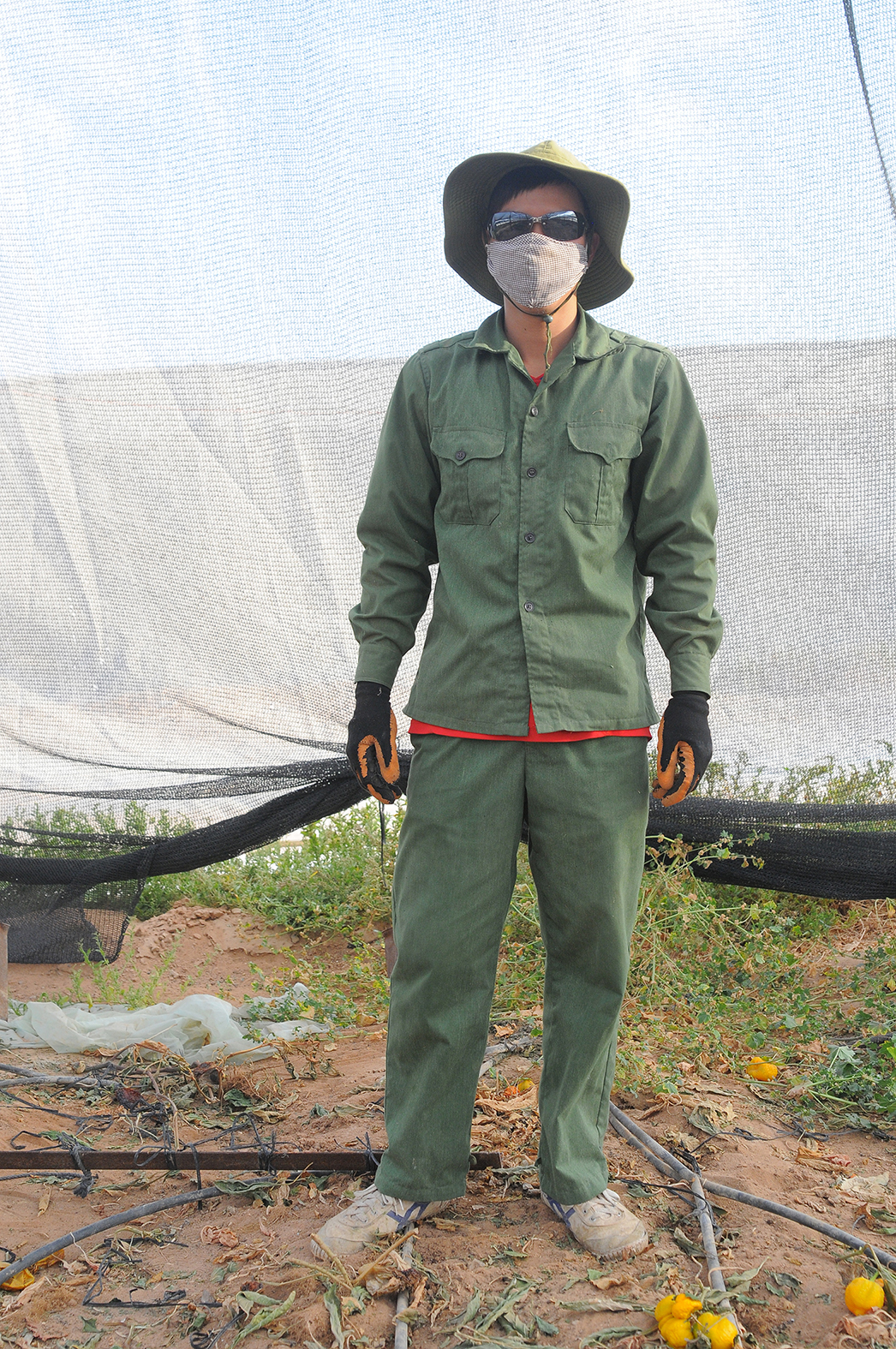 העבודה היא שדרת חייהם, הסיבה שבשמה הגיעו לכאן, ועקבותיה נוכחים בתצלומים: בסימנים שהפועלים עוטים על עצמם – בגדים ארוכים, כובעים רחבי שוליים, כיסויי פנים וכפפות, בערוגות ובחממות המשמשות להם כרקעים, וכמובן בכלי העבודה שנושאים כמה מהם. השהיית העמל עצמו מפנה את הבמה לדרמה המתחוללת על פני השטח. הרמז המטרים לכך נמצא בהעמדה של הפועלים: הם ניצבים בודדים ונינוחים, מעלים על הדעת דוגמנים לעת מצוא שנעתרים בשמחה להזמנתה של הצלמת.