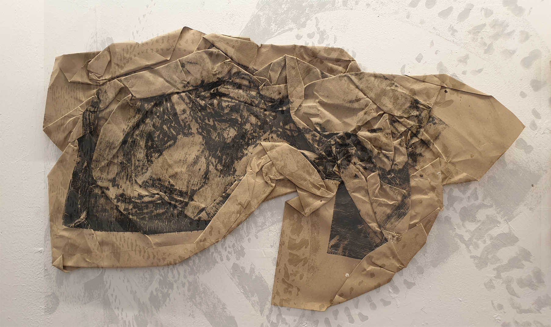 גד מדפיס במוקוליטו (טכניקת הדפסי אבן מלוחות עץ), שהודפסו באמצעות מכבש עשוי גליל כבד. תהליך ההדפס מקביל בין אירוע הדריסה והשיטוח בתהליך ההדפסה – מעיכת הנייר בגלגלי המכבש. לרגעים הנייר המקומט ושמא פגום יקבל צורת חיים חדשה בעלת גוף- תלת ממדי .