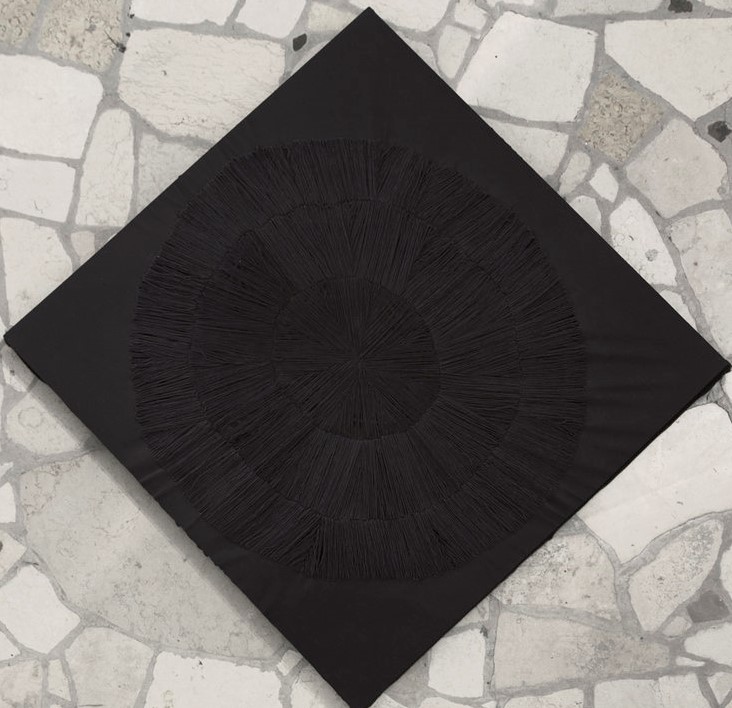 מימי טסמה עוסקת בזהות האתיופית שלה, כשהיא מותחת חוטים שחורים על קירות בין מסמרים ויוצרת מהם דגם שמתכתב עם דגמי הרקמה האתיופית המסורתית. אצל מימי ה”רקמה” היא בחוט שחור.  היא מצמצמת את הפלטה הצבעונית שלה ובוחרת בהתרסה להנכיח את השחור, וגם הבד עליו היא רוקמת הופך לשחור. הצמצום הצבעוני מוביל לצמצום צורני לקווים, ולרשתות מעוינים. דגם המעוינים מאזכר סורגים וגדרות, מחיצה, גדר גבול שמפריעה ומנתבת את מהלך הצופה בחלל. זוהי פעולה כוחנית, כמו גם עבודת דפיקת המסמרים בקיר. הדגם האתיופי הפולקלוריסטי, הרקמה הנשית, הפך לגריד המערבי, המופשט והגיאומטרי, הכוחני והגברי.