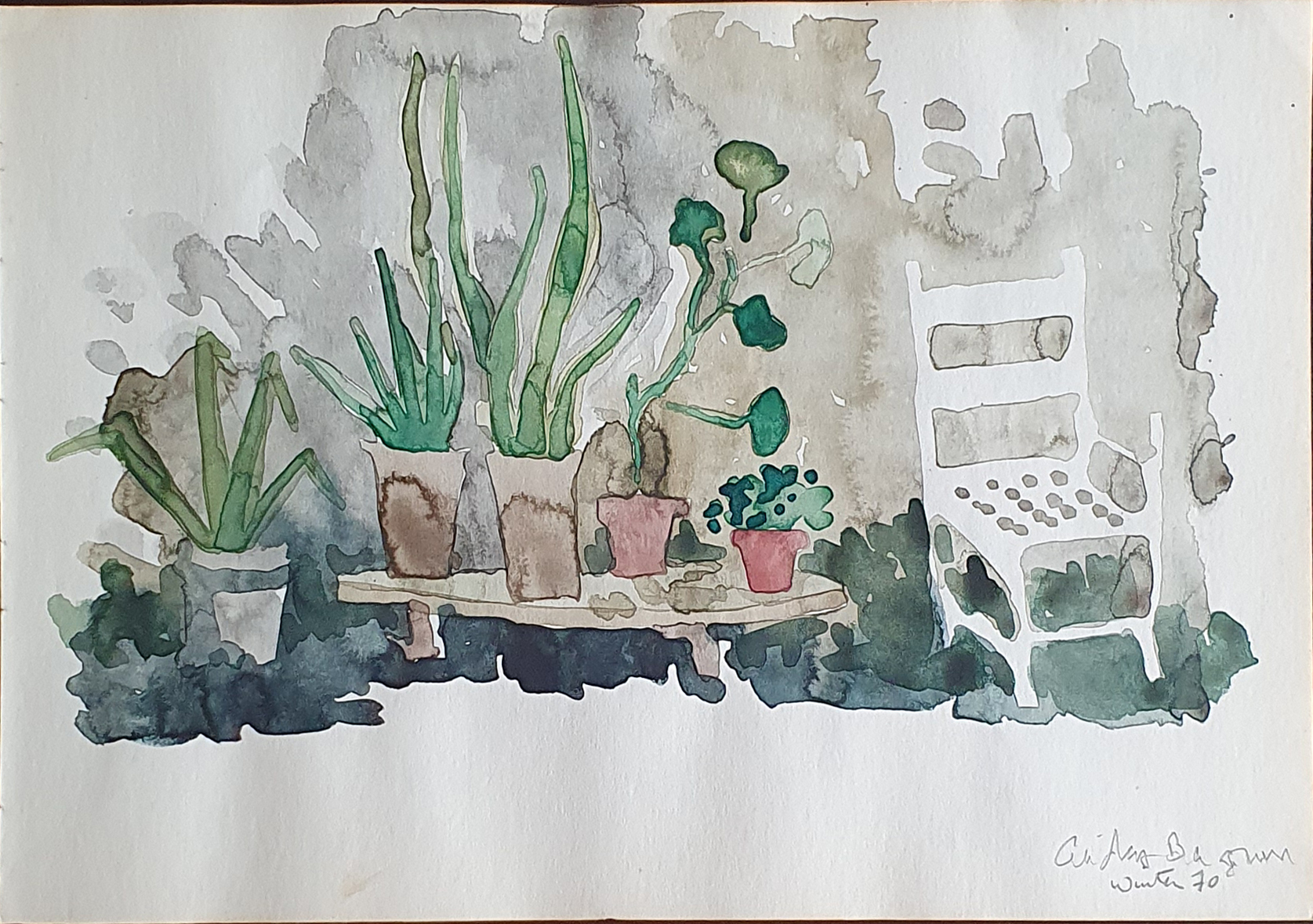בשנות ה-70, לאחר מות אימה, ביקרה תדיר את אביה במחוז דבון (Devon) בדרום אנגליה. הביקורים הניבו סדרת אקוורלים מכמירה, הנעה בין פיגורטיביות להפשטה ומתעדת את דמות האב בסביבתו הטבעית: ישוב מכונס בכורסה בסלון ביתו, מהלך או יושב בגן המוריק עם כלבו האהוב לצידו.