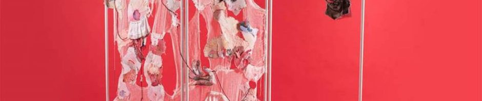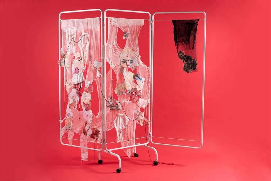 העבודות לא נדרשות למילים, תיווכי זה כאוצרת לוקה בחסר, למול מלאכת רקמת טלאי הכאב והאימה, המורכבת מיריעות גזה – תחבושות, חלקי קנבס משומשים, ציורי מים ישנים שנקרעו והתפקדו לשימוש חוזר באמצעות תפירה, החוברים לאמירה שהינה בבחינת ג’יבריש[i] המבקש לזעוק ולמלל את שאירע. אלא כשם שאין ביכולתו של הפעוט לארגן את הסיפור באופן קוהרנטי ורציף ולהשמיעו כעדות מילולית בהירה, כך גם פני העבודה.