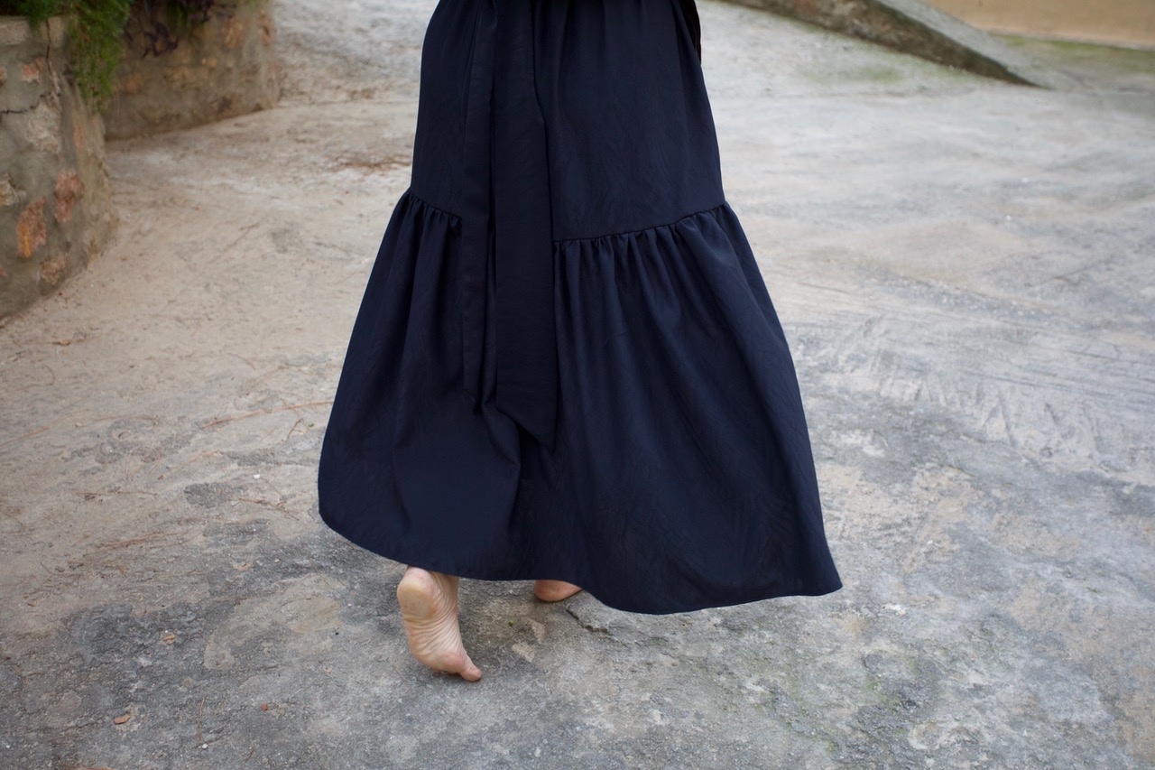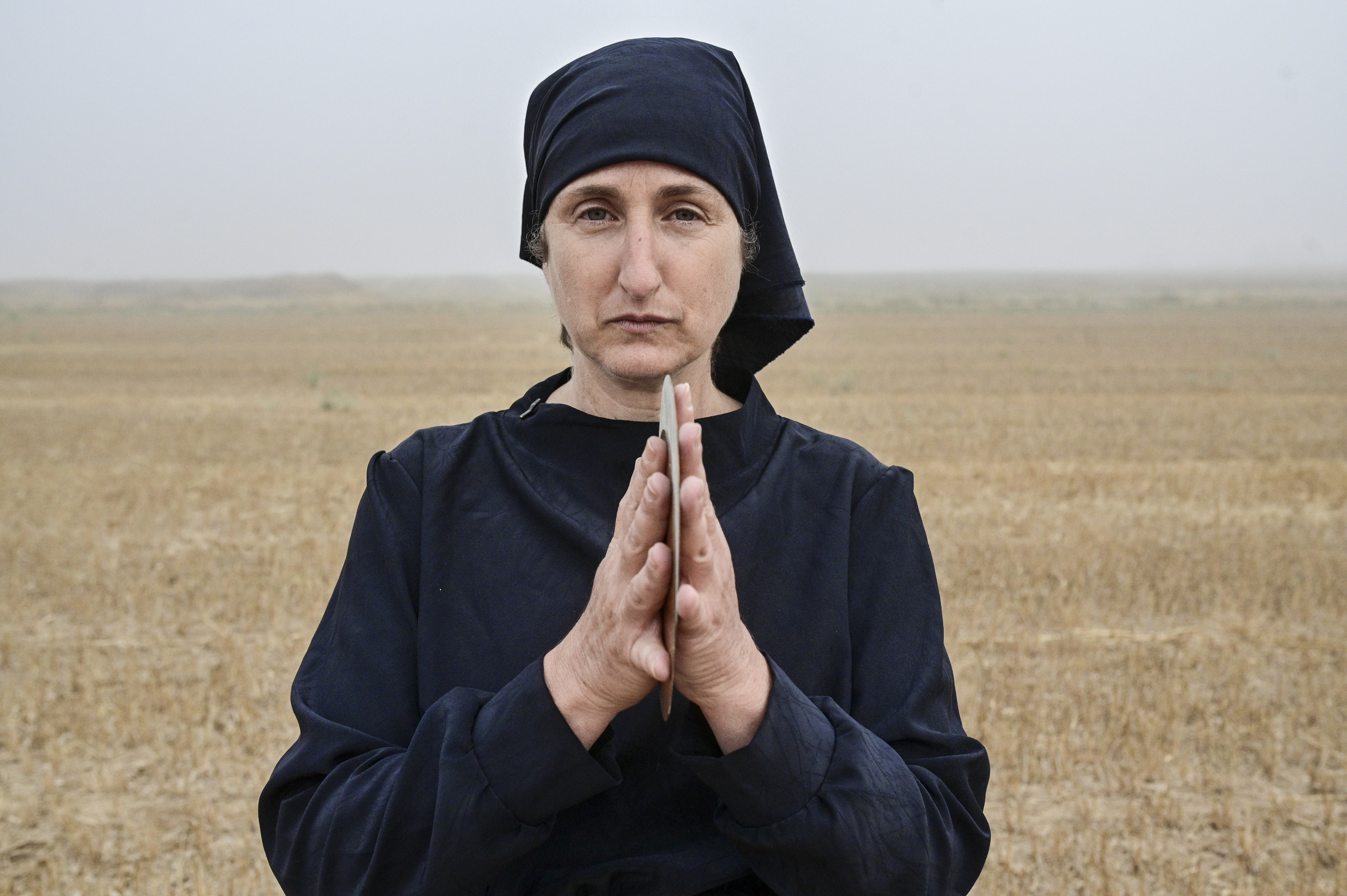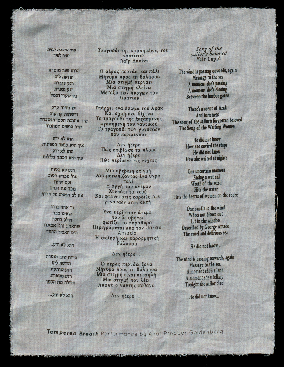 ענת פרופר גולדנברג בחרה לערוך ולצלם את הפרפורמנס שלה בשדה חיטה באזור מתחם התחמושת שבין נחאביר, בארי הישנה, לבין מפעל הגפרית הנטוש, 2 ק”מ מערבית לקיבוץ בארי, ובמרחק 3 ק”מ מהעיר עזה. שדה שקט ופסטוראלי, טעון היסטוריה מקומית, שידע מלחמות רבות, שיגורי טילים מעזה ושריפות מדי קיץ. הפרפורמנס מתבצע על ידה כשהיא לבושה בשמלה כהה ומטפחת, חגורה סינר מנחושת מרוקעת בעלת עיטורים רקומים מעשה ידיה. היא צועדת במרחבי השדה, מחככת ידיה זו בזו בתנועה סיזיפית אין סופית, תוך שהיא צועדת במעגלים, יחפה, ורגליה משתפשפות ונפצעות מרגבי האדמה והאבנים. ברקע בוקע הסאונד של קולה של האמנית, החוזרת ומדקלמת באיטיות ובתשומת לב לכל מילה את שירו של יאיר לפיד “שיר אהובת הספן”. לפיד כתב את השיר בהשפעת ספרו של ג’ורג’ אמאדו “ים המוות”, רומן המתרחש על רקע חיי הספנים והדייגים ברציפי הנמל של באייה, בברזיל. הוא מתאר את גורלן של נשות הימאים, שנגזר עליהן לחכות בחשש לשוב יקיריהן מהים. ואצלנו – מי היא האישה המחכה, הנשכחת? למי היא מחכה? לאהובה שלא ישוב מהקרב? לבנה שנשלח למלחמה בעזה? עד מתי היא תחכה בסבלנות שהרע מכל יקרה? האישה מופיעה בכל מסך בגלריה מכיוון אחר, ומבלי משים מכפילה עצמה והופכת לנשים. פעם מימין ופעם משמאל או ממרכז השדה הרחוק, מתקרבת למולנו ומייצרת טקס פולחני נשי, ציפייה מורטת עצבים ועיסוק בשכול.