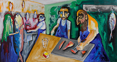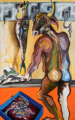 תערוכת היחיד של דינה יקרסון המינוטאור והדג כוללת סדרת ציורים מהשנתיים האחרונות. העבודות מתארות סצנות שונות מחיי היום יום בשילוב עם דמויות מיתיות שכמו מבליחות במרחבים שונים – בחנות דגים, מסביב לשולחן, בחדר, על שפת האגם או על גבי רקע מופשט. הציורים מתארים התרחשויות קונקרטיות המכילות אלמנטים פנטסטיים אשר מערערים וסודקים את תפיסת המציאות של הציור.
