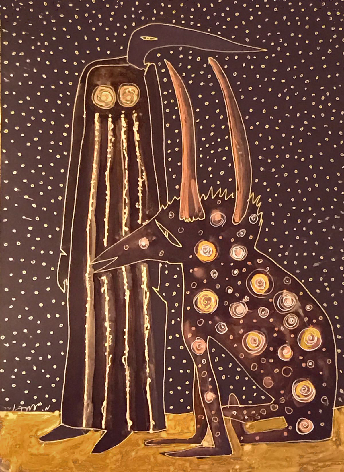 הקו הוא המקור לכל יצירה. בתערוכה מוצגים יצירות חדשות מקו דיו וזהב של “בעלי מקור” שונים מעולם הדמיון, לצד הדפסי תחריט שנעשו בזמן השהות בסיטי בפריז בשנות ה-80. הודות לכך, מתפתח בחלל התערוכה הקטן, המזכיר קן ציפורים בפני עצמו, קו נוסף המחבר בין ישן לחדש ובין סגנונות שונים המהווה, בפני עצמו, מקור להשראה וליצירה.