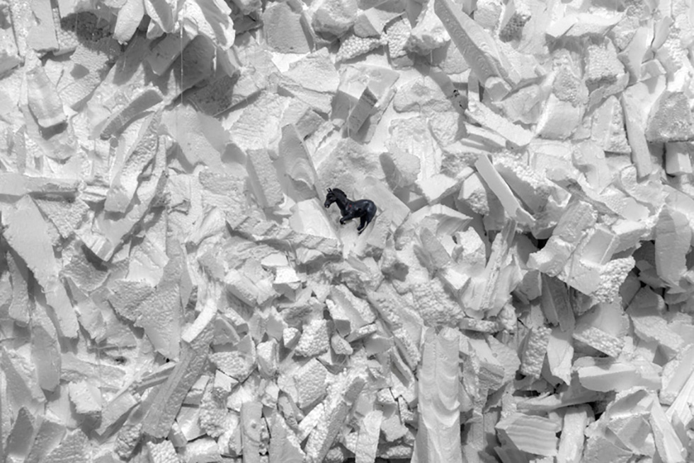 הפיסול מכיל בתוכו הקרנות וידיאו וסאונד, שיחד ממחישים את סכנת הקיום האנושי נוכח הטבע המתכלה. אם נחפש באנטארקטיקה, כבקשת המשוררת, נמצא קרחונים מתמוטטים אל הים וסוסים שלא מדברים אף שפה נמלטים על נפשם ונופלים לתהום שיד האדם הייתה שם כדי ליצור אותו, בלופ מתמשך.