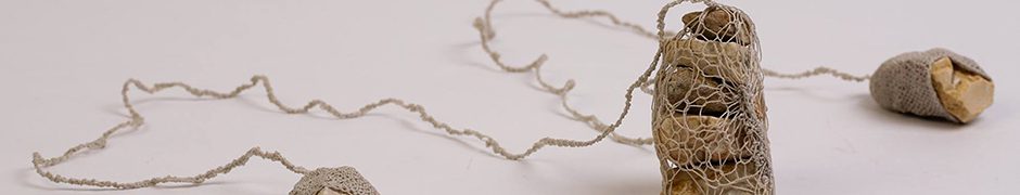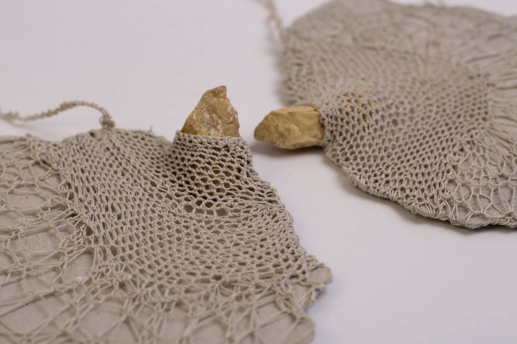 את הגוון הבהיר של האבן. בחלק מהעבודות יש שימוש בקרעים של קרטון אפור לעיתים כמצע לחיבור של האבנים וחוט התפירה ולעיתים רק עם חוט התפירה במפגשים המאזכרים נוכחות של אבן שאיננה. המבנה של ‘העיניים’ שהסריגה יוצרת, פעם מסודרות, פעם צפופות, פעם אווריריות, מאפשרות ליצור גוונים ומופעים שונים למגע עם האבנים.