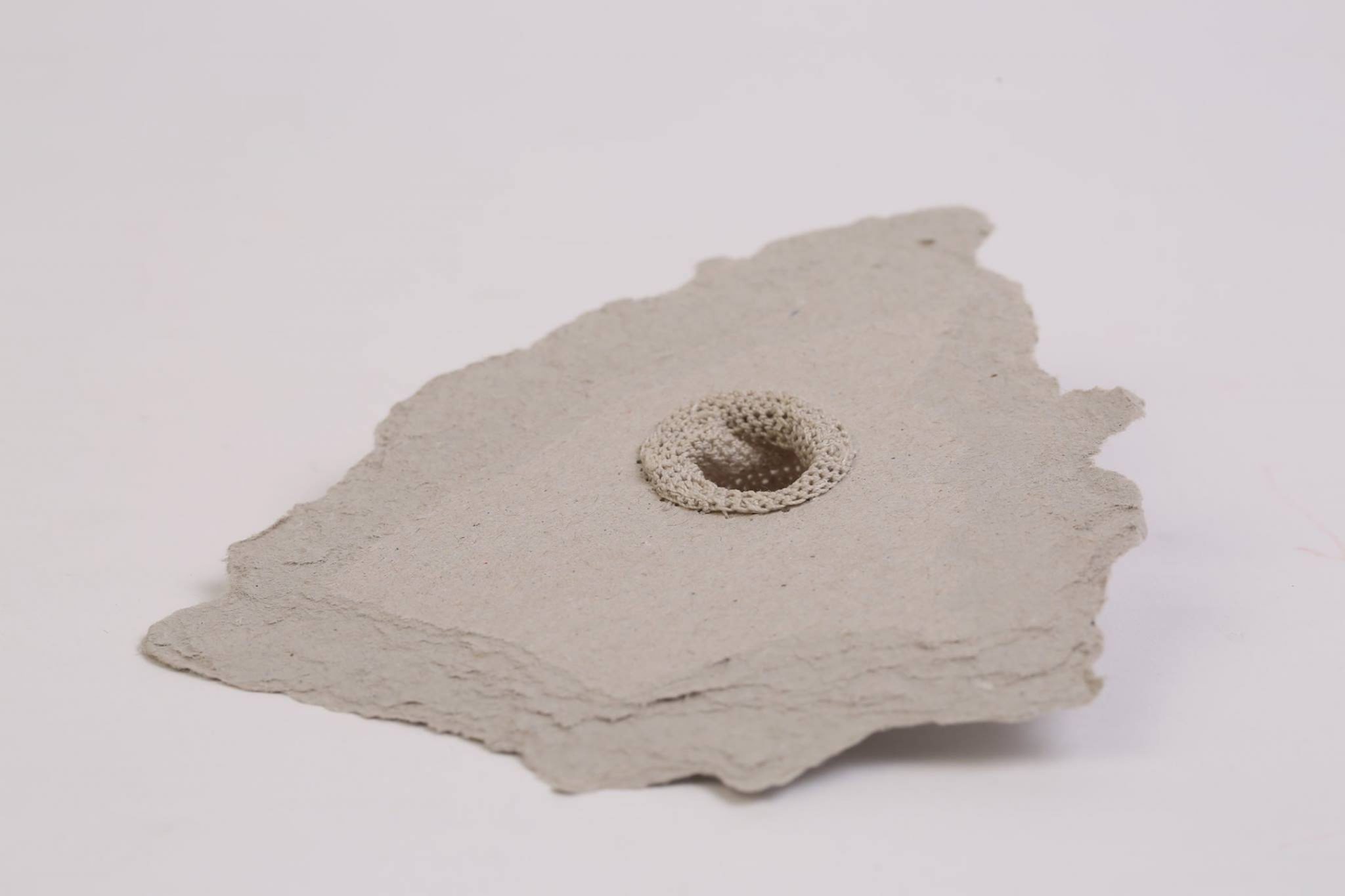 בתערוכה “ארכיטקטורה של מגע” בחלל גלריה פריסקופ, מוצגות שלוש סדרות של עבודות המשתמשות בחיבורם העדין של חומרים גולמיים כמו חוטי תפירה, אבנים, קרטון ומסרגות.