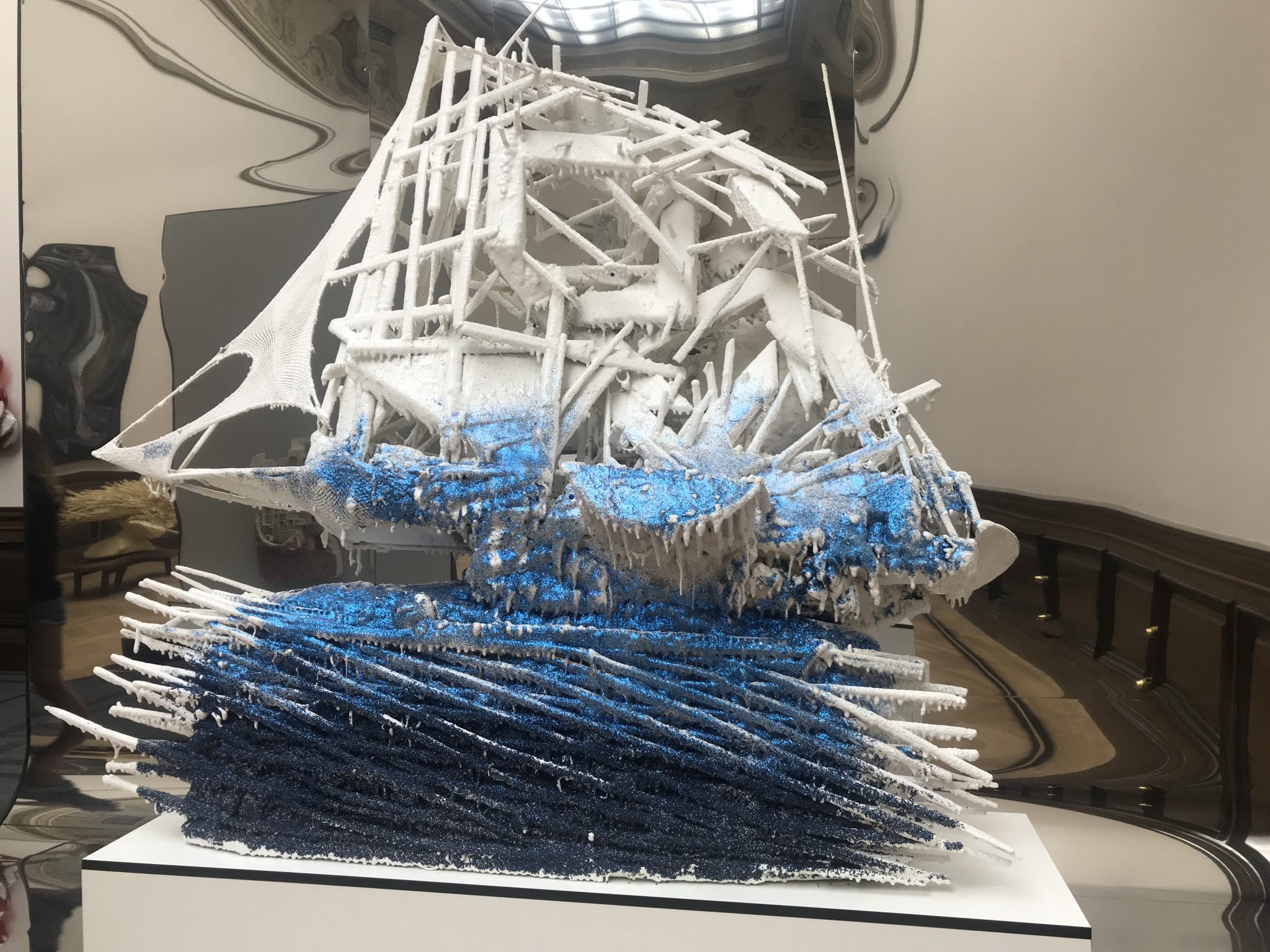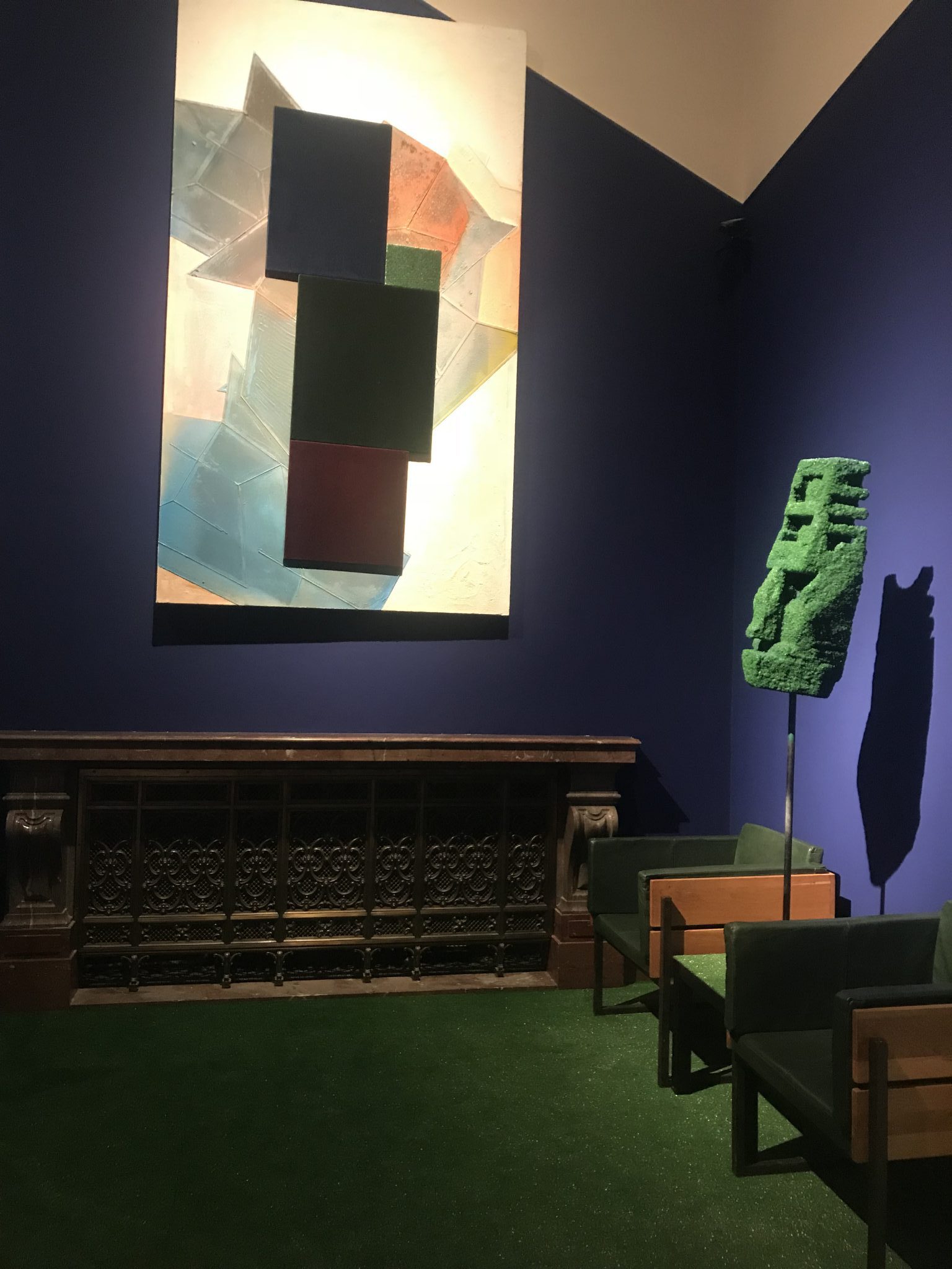 Písařík’s works bring to mind Rauschenberg’s American Pop Art, Murakami’s paintings, and the Early Modernism of Max Ernst and Miro. For example, a head/mask from synthetic grass, looking like an Easter Island statue, or a shipwreck on iron waves along with a sculpture looking like Russian Constructivism. In some pieces, he uses furniture that seems to be from la Belle Epoque. The artist’s playfulness between the monumental and kitsch leaves visitors wondering whether he is admiring the past or mocking it. His poetic works are sharp but not vulgar, questioning intercultural issues, from his faux primitive head to his distant view of the utopias that failed. The artist, a type of “maker,” proposes an interaction between memories and materials, promises and failed promises, and an earnest sense of play.