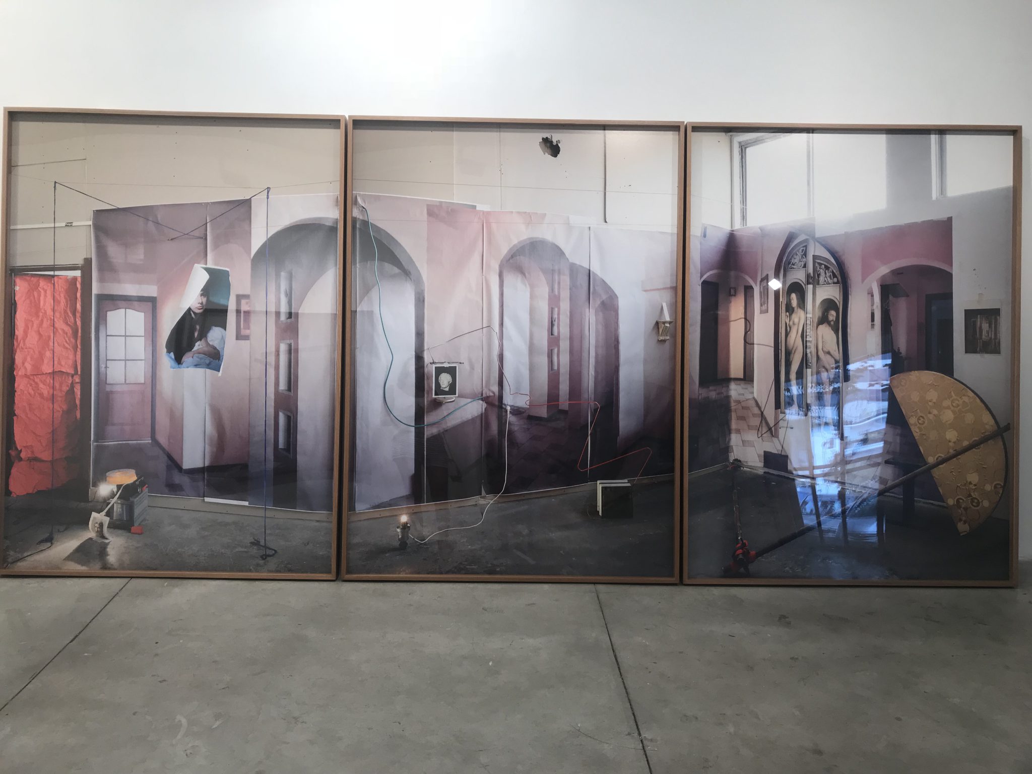 In the studio, Yashaev constructs installations composed of objects and photographs he hangs on flats like stage sets. In most of the works, visible electric wires and ropes seem to bind sections together in illogical connections, as the exposed veins of a concealed circulatory system. Yashaev photographs the installations then flattens them out into a collage of battling spaces rich in art historical references, chief among them Adam and Eve from the Ghent altarpiece attributed to Hubert and Jan van Eyck (1420-1430). It seems that the space Yashaev photographs is a direct continuation of the gallery, separated from it only with glass and a frame. Thus he approaches the theatrical to enter the longstanding discussion of the place of the “fourth wall.”