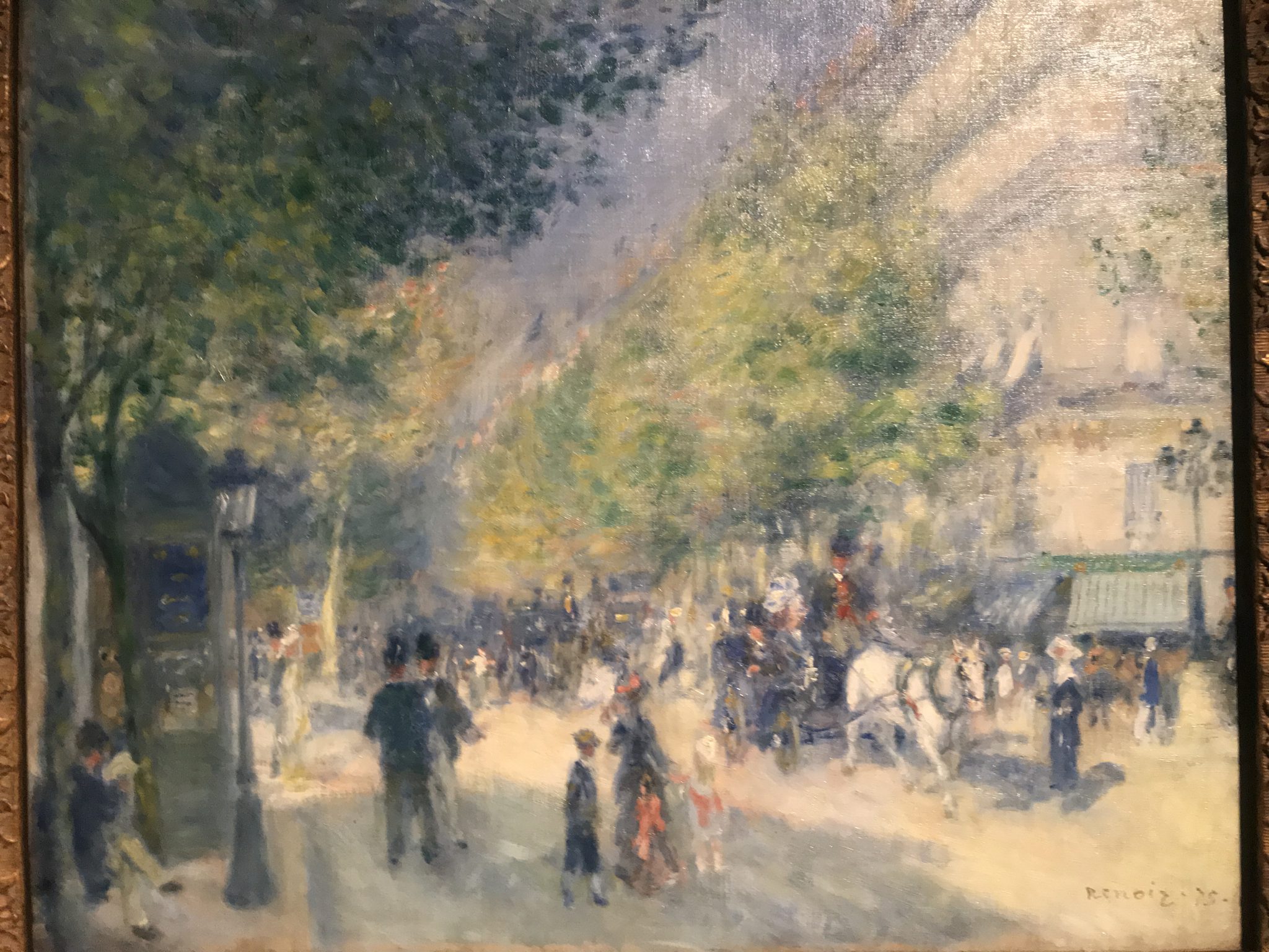 בשנים בהן צויר “השדרות הגדולות” רנואר הרבה לצייר בחוץ וכמו מונה בחן את השלכות ההבנה החדשה של צבע וראיה . במבט מההווה, הפרויקט הפריזאי הגדול מסופר רק מנקודת הראות של הבורגנות . החלשים , דרי משכנות העוני הוגלו מן העיר בפעולה מובהקת של גנטריפיקציה. במרכז הציור של רנואר אנשים לבושים היטב : שני גברים במגבעות ואשה עם שלושה ילדים . באותה שנה ממש , כשרנואר מציר את הסצנה השוקקת , הדשנה גוסטב קלאבו Gustave Caillebotte מצייר התבוננות מהורהרת, מבחוץ על השדרות ואת הבדידות בהמון .