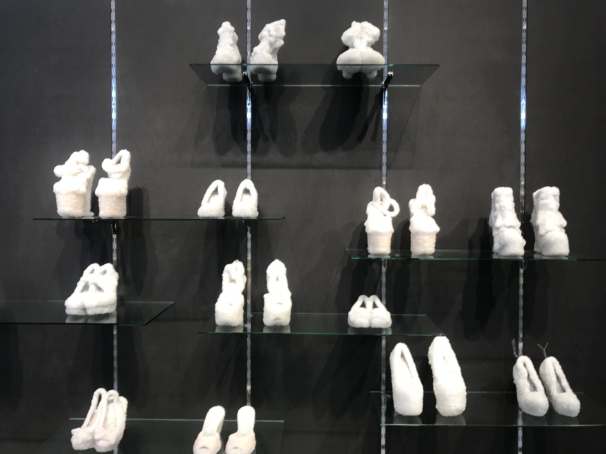 קיר הנעליים אינו דיבור על ראוותנות אלא הוא אכן כזה – מפגן , מוצלח, של היכולת ליצור זוהר . הנעליים המבהיקות מבקשות נגיעה ודוחות בו בזמן , איזון מדויק של ריחוק שיוצרת אופנה עילית . הוא מעלה על הדעת את Prada Marfa המיצב דמוי חנות פראדה של Elmgreen and Dragset שהוקם בטקסס ב 2005. השניים בנו דגם חנות של פראדה, קיבלו מהחברה סחורה מקולקציית אותה שנה (ואישור להשתמש בלוגו ) ויצרו דיבור על מיתוג, פרסום, צרכנות. העבודה הפכה לחנות המזוהה ביותר של פראדה אף שאינה מתפקדת משום בחינה כחנות. האובייקטים שבה, נעליים ותיקים נערצים ונחשקים, פסלי אלילות עכשווית .
