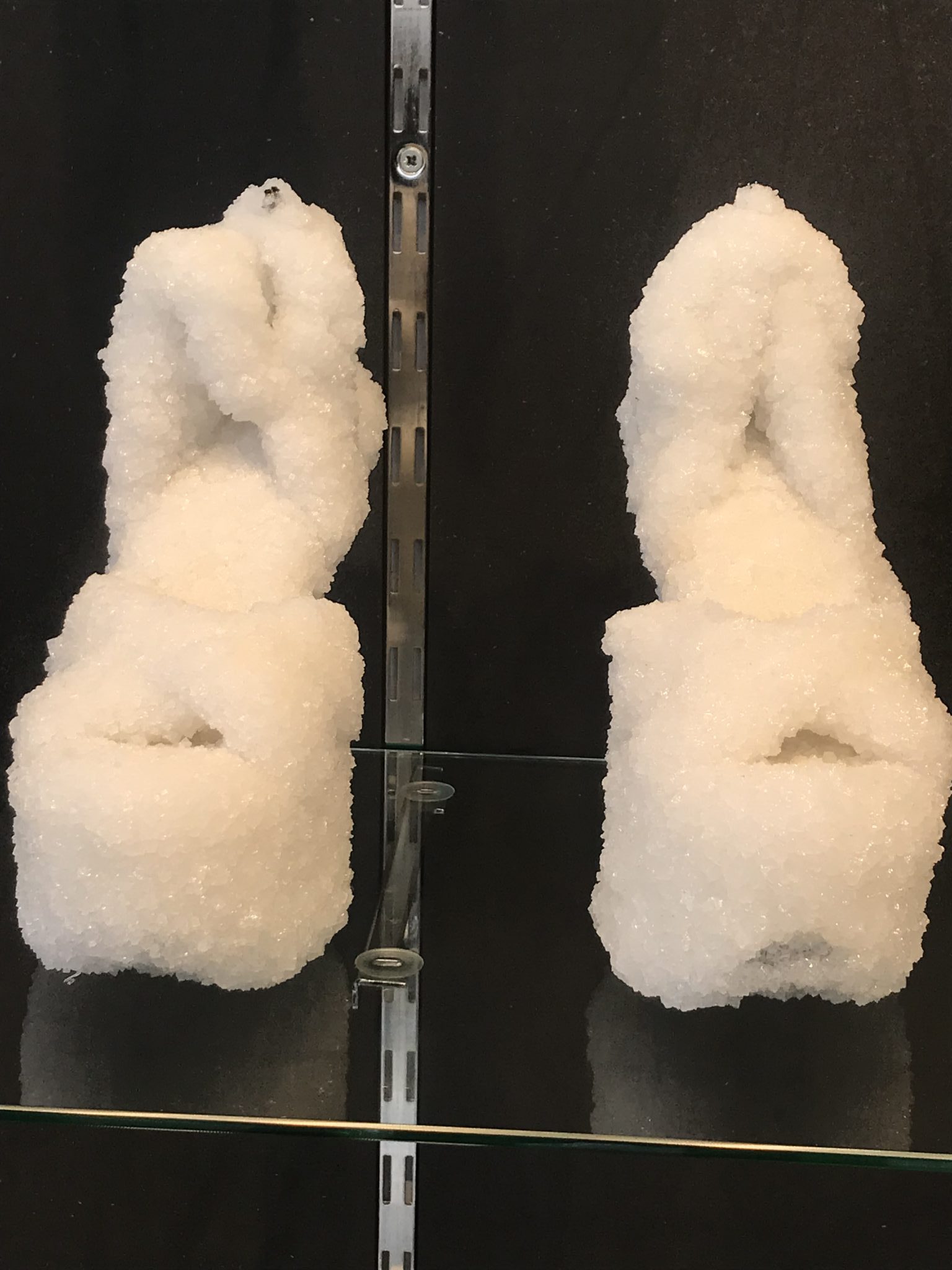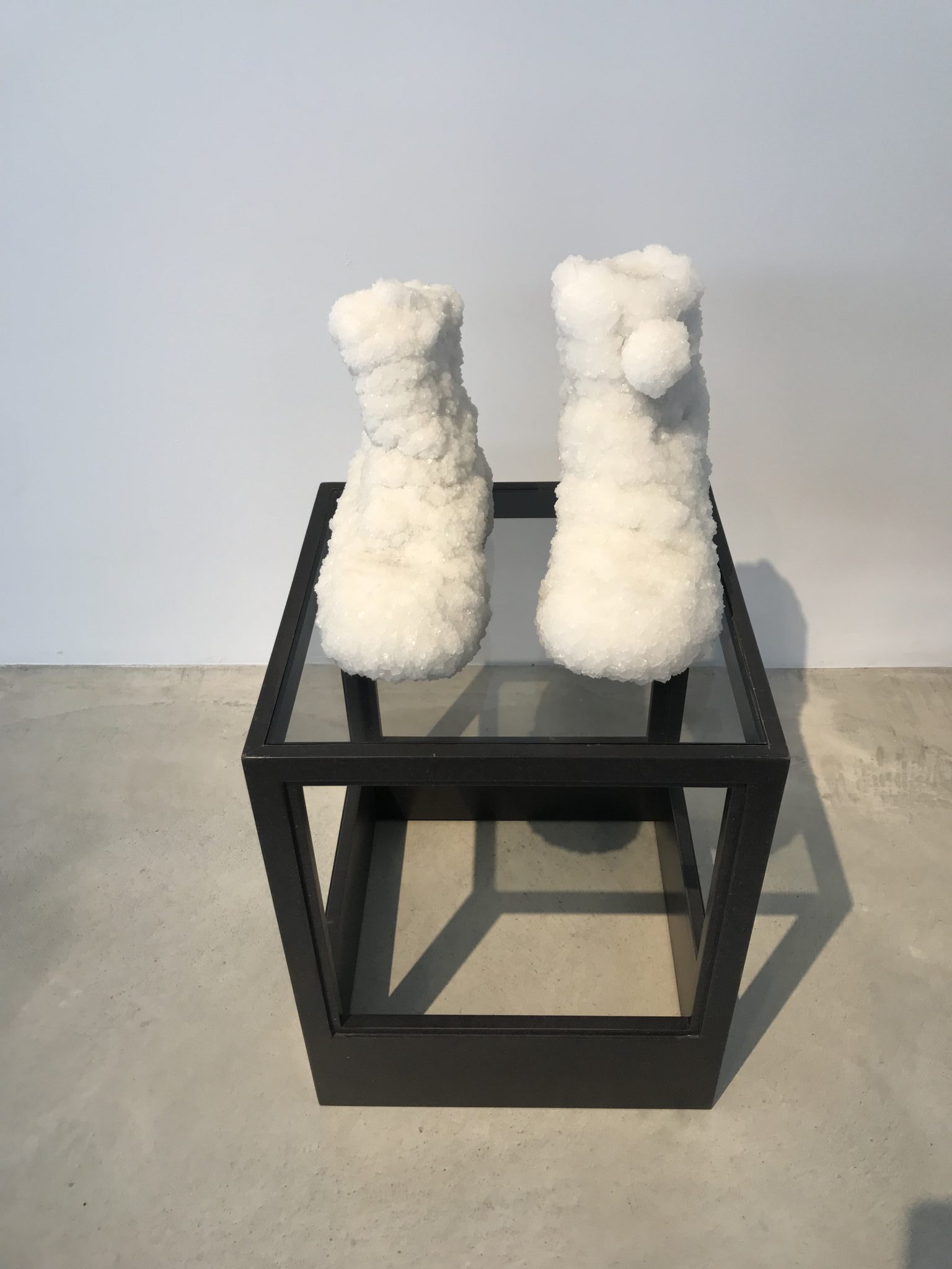The works lie in the liminal field of art/design (or design/art). Over the past two decades, Landau has been fossilized salt objects, glittering in white. While the early ones such as wheels or lampshades (part of the breathtaking series exhibited in New York’s MOMA in 2008), gave the sensation of engaging in wounds, pain, it is missing from this exhibition. That sensation was present in the video “Salt Crystal Shoes on a Frozen Lake, Gdansk” (2011) shown at the Venice Biennale, which brought to mind the horrors of World War II followed by the Communist regimes.