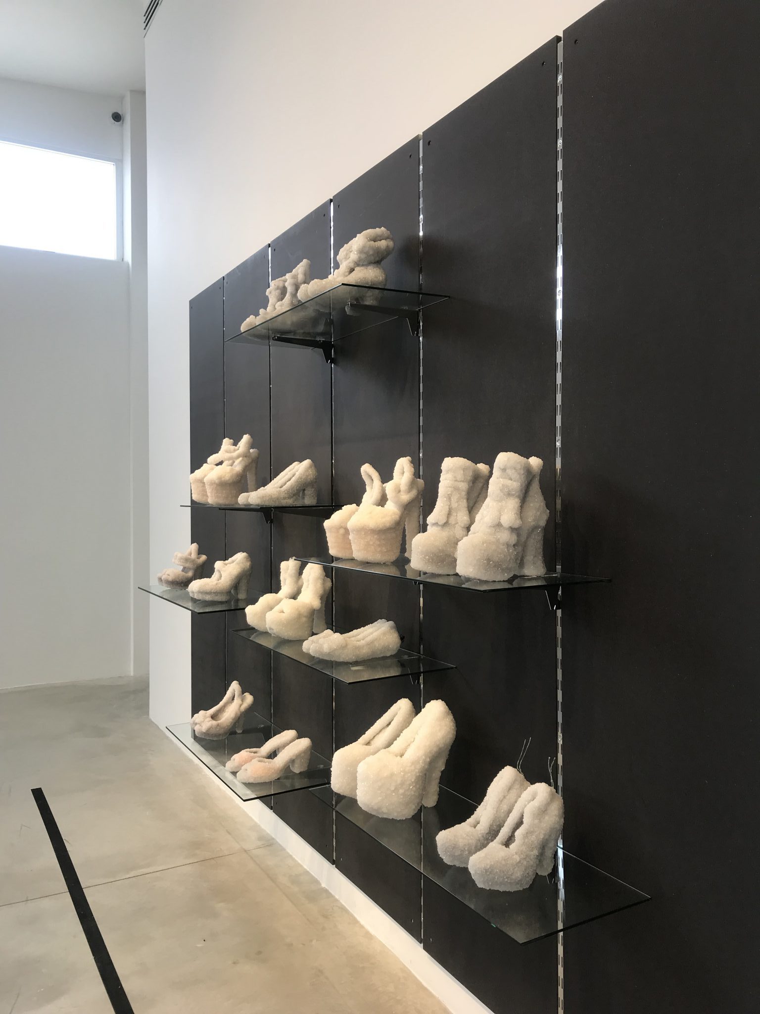 The display of shoes in the current shoes is reminiscent of Prada Marfa, the installation resembling the mock Prada shop by Elmgreen and Dragset, installed in Texas in 2005. The duo built a model of a Prada boutique and received from the company shoes from that year’s collection and permission to use the logo, thus creating a discussion of branding, advertising, and consumerism. The artwork became the shop most identified with Prada even though it does not function as a shop. The objects of desire inside it – shoes and handbags – are contemporary idols, a definition that seems to be the ambition of the objects in the current exhibition.