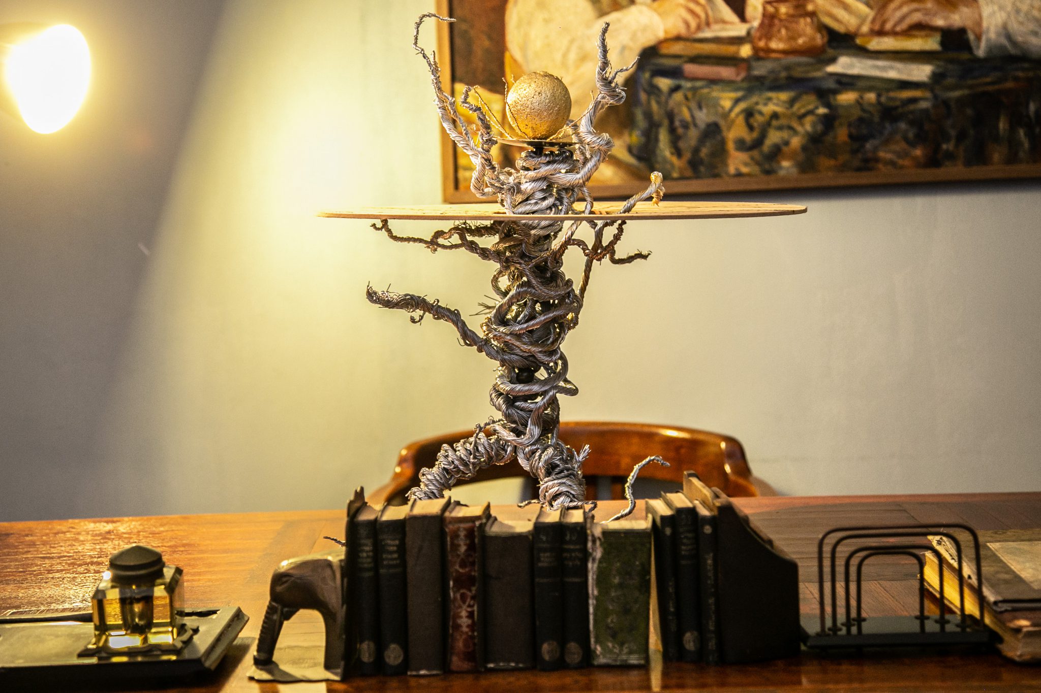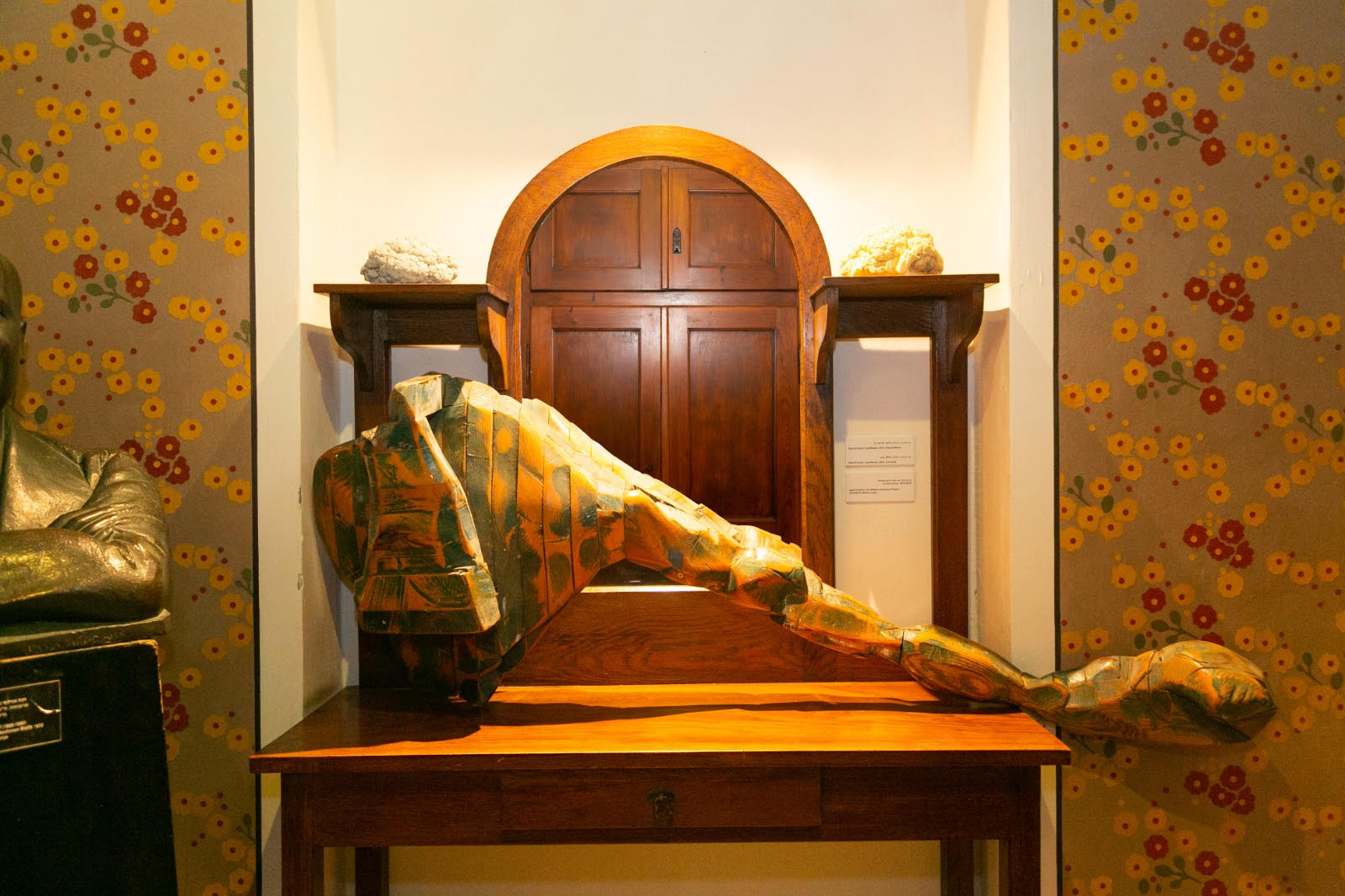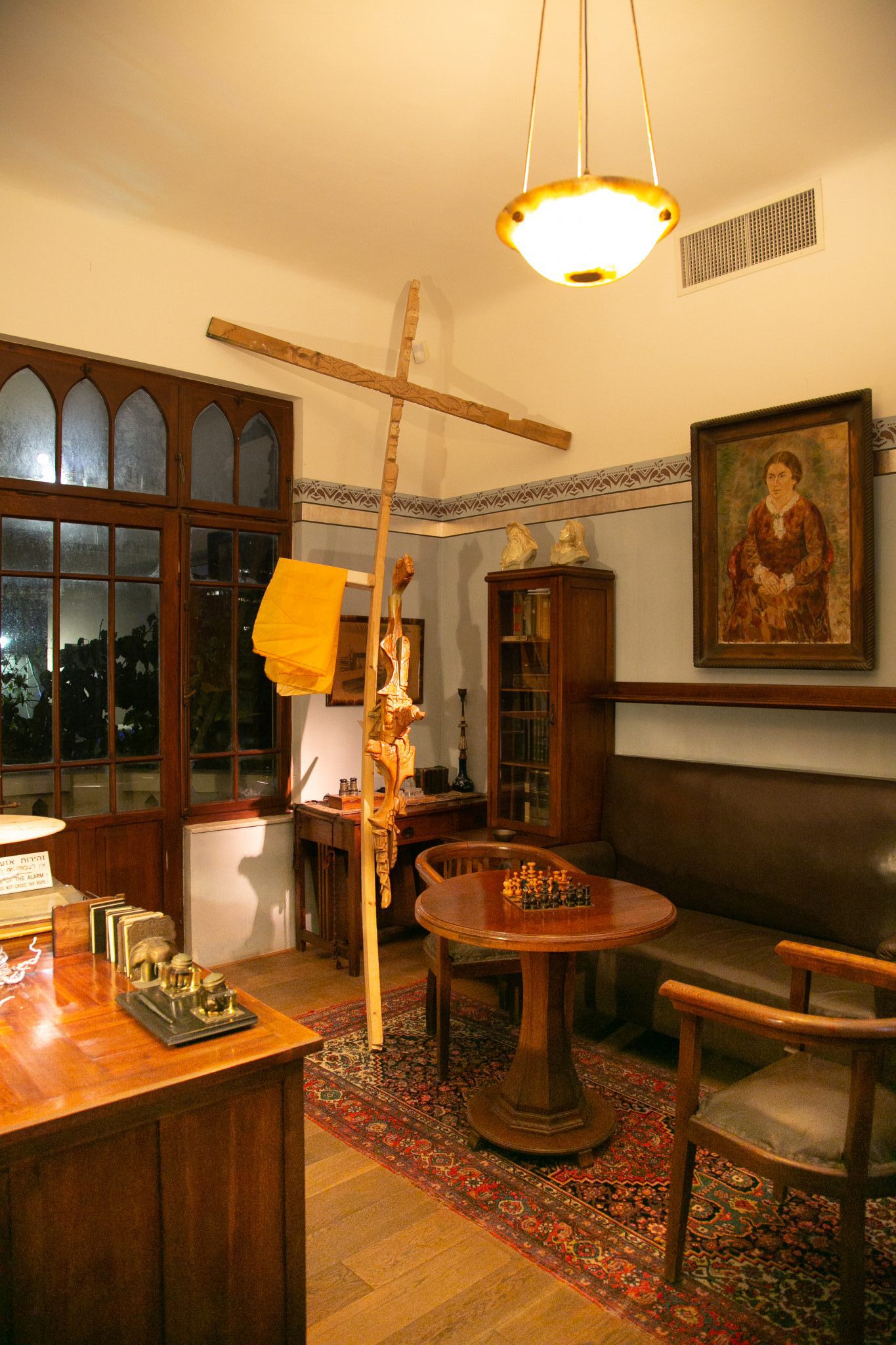 פסל עץ של קריכלי, הנראה כאסטרולאב, מאלו דרכם ניסו לפענח את סודות היקום, שכוב על האח בחדר ההסבה.
