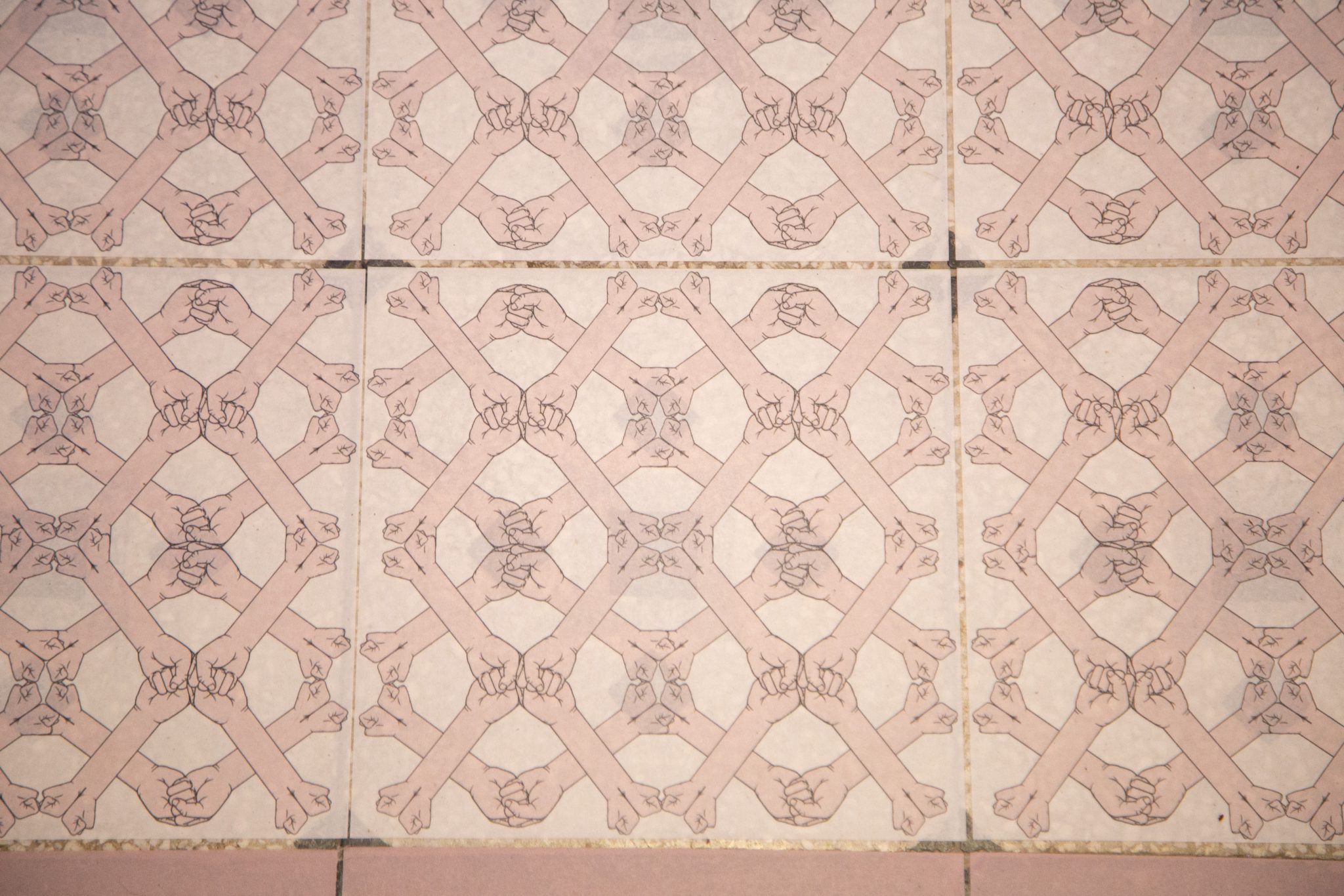 Lital Rubinstein’s works are kinetic or potentially kinetic. She employs pink, the color of innocence, contemplating the constant tension intrinsic to relationships. In the floor piece Waltz, the pattern of severed arms grasping each other or clashing is in dialogue with the typical floors of Tel Aviv homes and the Bialik House. The image is ambivalent: the clasped arms can be read as either supportive or aggressive, close or alienated. The association to the floor pieces by Ai Wei Wei, one of the most outstanding contemporary international artists, is conscious. While Ai Wei Wei refers to absolute alienation and subordination, Rubinstein leaves room for doubt and perhaps a return to closeness.