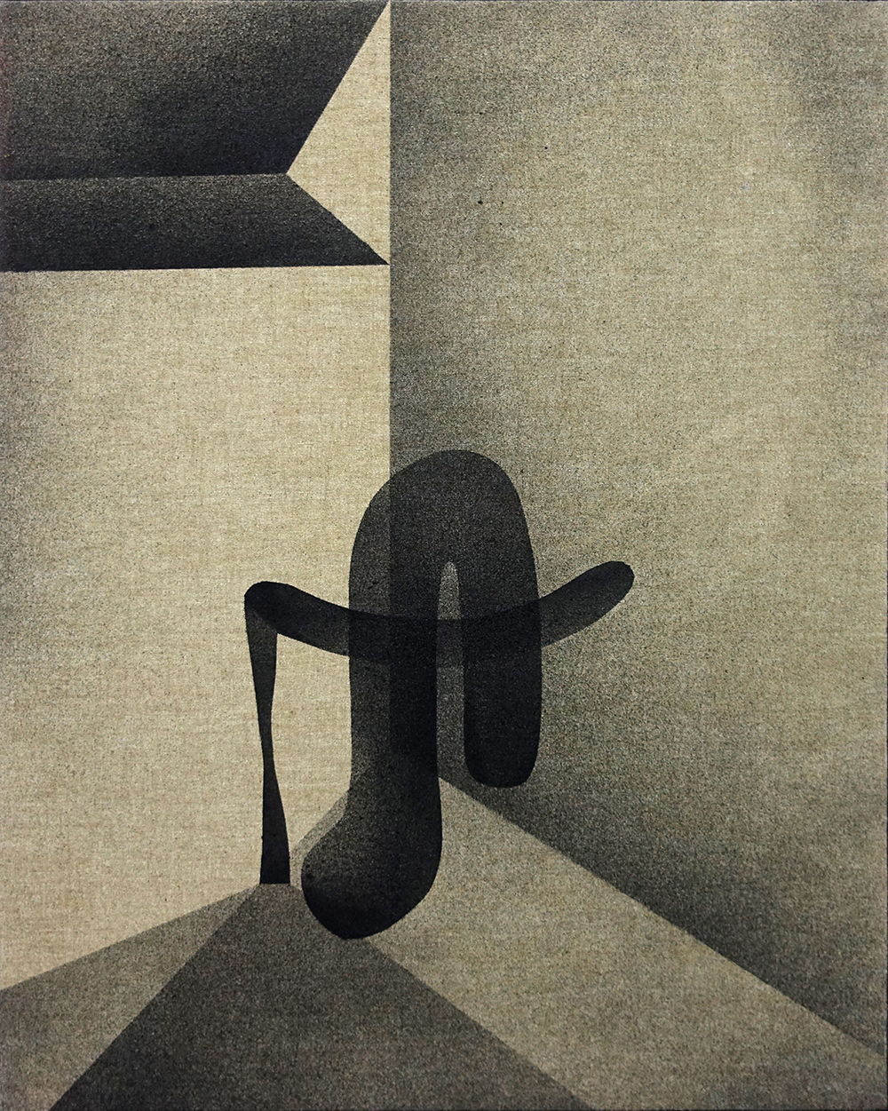 Klone’s new exhibition is surprising, distant, and relatively restrained. Paintings made with spray paint on canvas replace the rich ink and paint works in his previous exhibition (http://old.smadarsheffi.com/?p=6458), and different from the street art with which he has been identified in the past. The spray paint technique is more commonly used in graphic design than in art. Klone employs it breathtakingly and generates dryness in measured doses with precision control, with the best pieces razor-sharp.