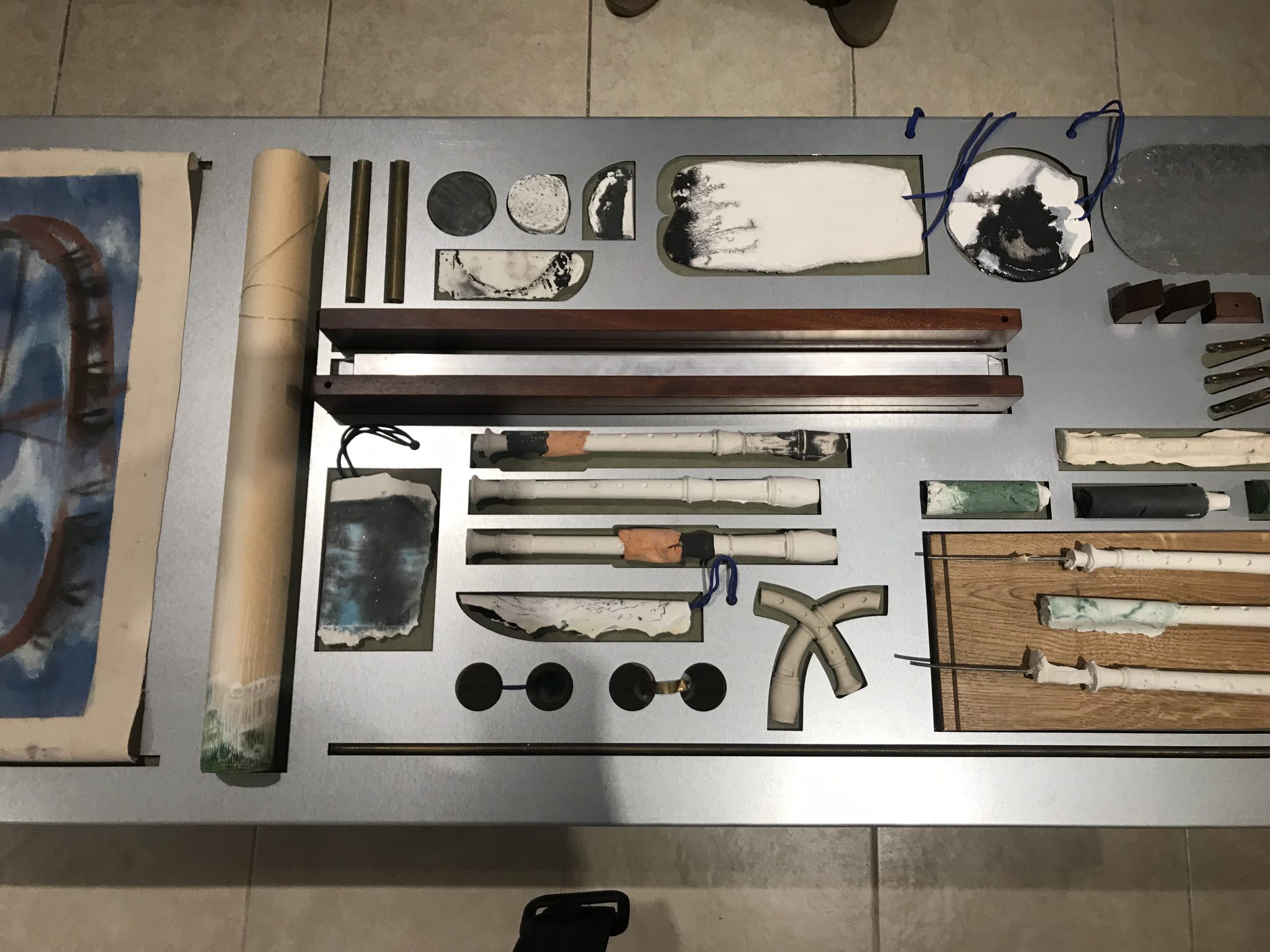 מתן אורן יצר מיצב אופקי של חלקי עבודות מהסטודיו : כמו ערכת עבודה (Kit) להתחלות של פרויקטים שכשלו או כאלו שהופסקו מאחר והחליט לא להוציאם לפועל, כלי עבודה או אוביקטים שמחכים לשימוש שיעשה בהם. אורן נוגע באחת ההגדרות הבסיסיות של אמנות – עשיית סדר בכאוס . כאן הוא נאבק בכאוס ולאחר שהחליט על הסידור של החפצים שלהם , באפן המזכיר ספק אפסנאות ספק ארכיב בנה עבורם מדף/שולחן מתכת ובו מגרעות מותאמות למידות ולצורות . השולחן העמוס לעייפה מונח בגובה נמוך אך מעל לקרקע , כמו מיטת אשכבה לחלקי הכלים , לחליליות לצירי הדלתות , לה שיכול בסיטואציה אחרת להיות מרכזי . העבודה של אורן נוגעת באופן חריף מאד בחסר , בפגום ובפגיע .