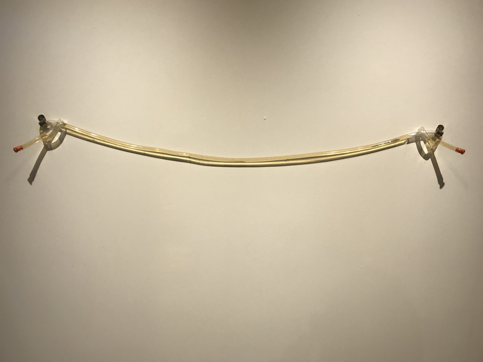 The works are placed one after another, unfolding like a scroll. At one end, near the door, a work by Flora Deborah is installed. Made of a transparent pipe with liquid inside, it brings to mind an infusion, tied at both ends. The image looks like the cloth ropes for queues, as if threatening to violently sever the connection to life, or a nasty smile looking from the wall. On the opposite wall is a large photograph by Michal Sophia Tobiass of the Batsheva Dance Company’s performance space of Ohad Naharin’s “The Hole.” The fabric surrounding the audience seats face the heart of the hall. An attentive gaze reveals sweat marks looking like phantom bodies of dancers. Only the edges of the white armrests are in the photograph, lacy edging to the black wall, absurd whiteness near the darkness of a void of what is not and the memory of what is.