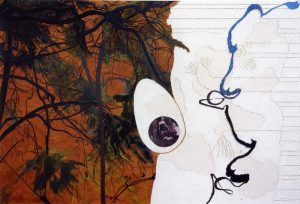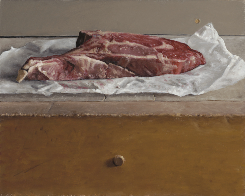 Aram Gershuni (whom I have also exhibited in the past) is represented by a large selection of paintings, from uniform in quality. The eggs in the painting of a bowl of eggs lack weight, roundness, and the sensation of fragility. There is refined precision in the violence in the superb work Regression in which a raw steak drips onto paper, while Death drifts out of it like vapor over the straight lines of a drawer, panel and wall. The ethical issue of such an extensive exhibition of works by a curator’s spouse in a public museum is open to discussion.