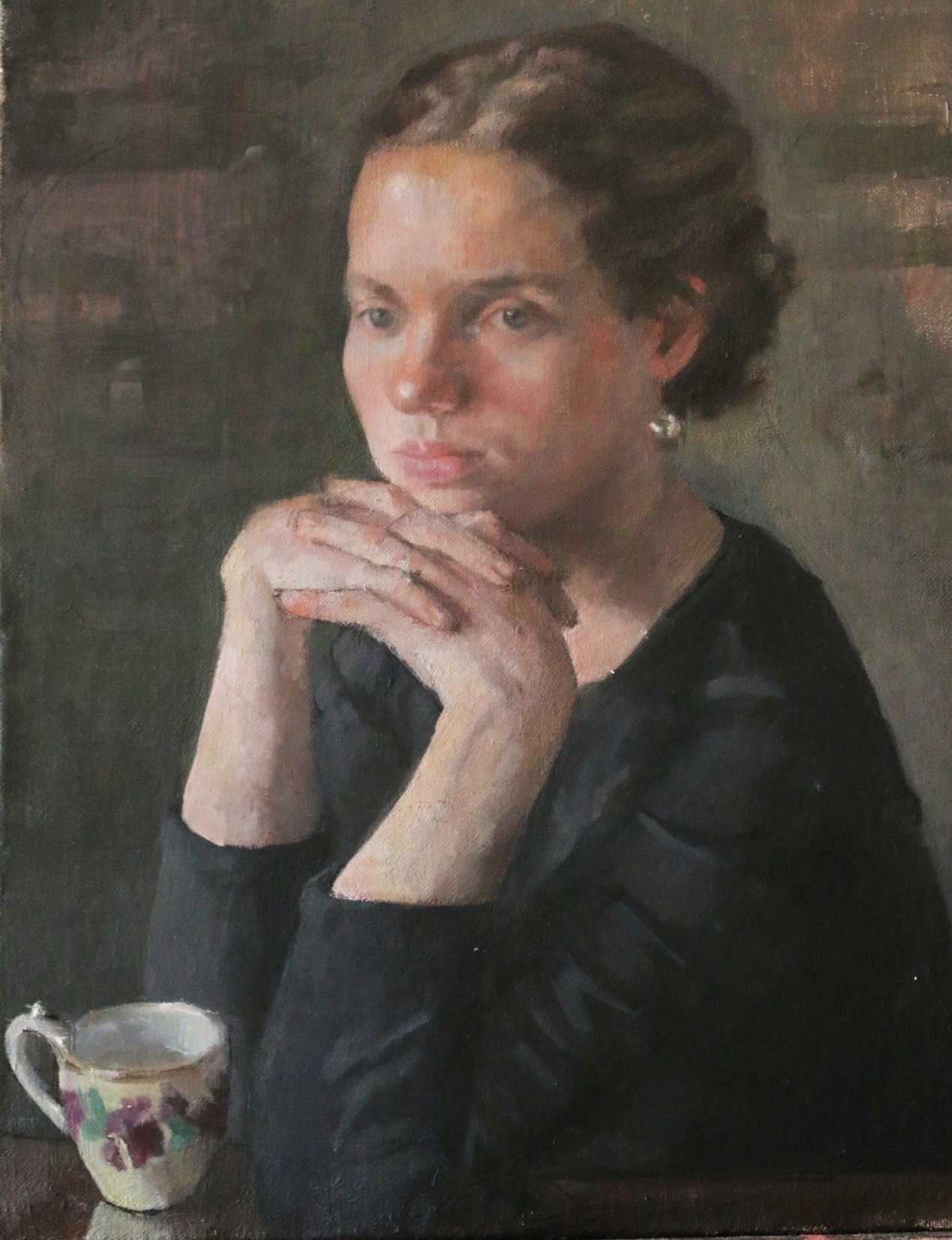 רוני טהרלב, נערה עם כוס סיגליות , שמן על בד,50 על 60 סמ