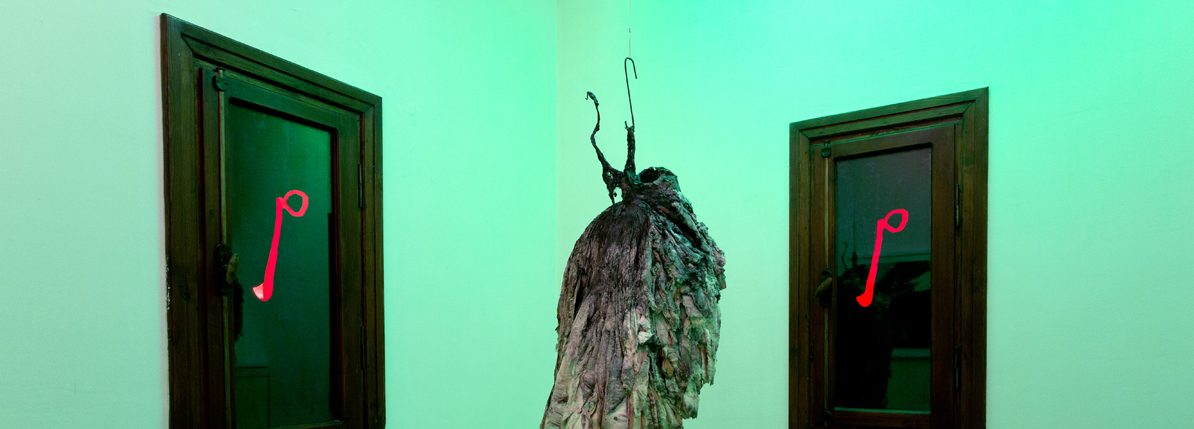 An amorphous object hangs at the center of the small square space on the Second Floor. It is made of layers of paper, cement, salt, plaster and fluorescent red and metallic green pigments. The object brings to mind flayed skin or an animal hide, especially Rembrandt’s Slaughtered Ox (1655) (and Chaim Soutine’s homage of 1925). The sensation of a life that disappeared, a feeling of loss, is located at the center of the space like a lump in one’s throat.
