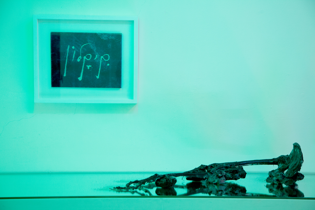 Sapir’s installation conducts a dialog with the word kikalon, touching upon the complexity of the text-image relationship. The image does not illustrate the text, is not it concrete realization, nor its translation: the image refers to the text as a parallel, sometimes developing from the text. Sapir adheres to Bialik’s handwriting, enlarging the word kikalon as originally written, extracting the word from its specific context. He connects it to various associative historical layers, and a wellspring of rage and despair embodied in the word.