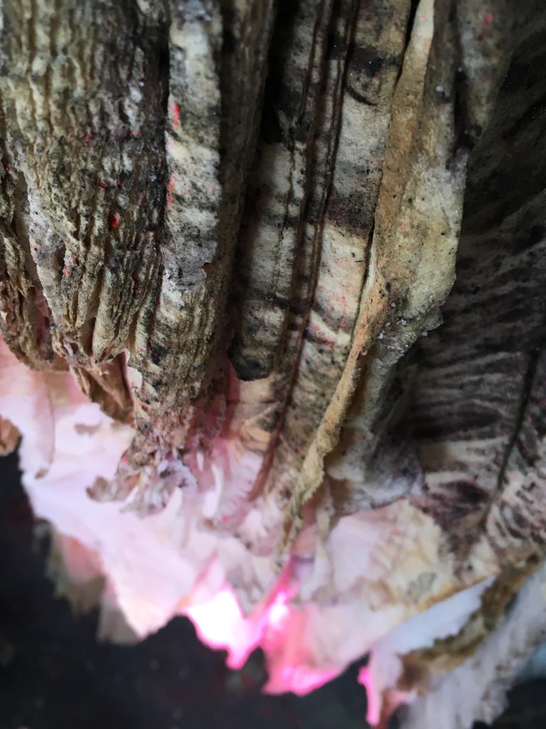 במרכז החלל הקטן, הרבוע, תלוי אובייקט א-מורפי העשוי שכבות נייר, מלט, מלח, גבס ופיגמנטים בצבע אדום זוהר וירוק מטאלי. אפשר לחשוב על עור שהופשט, או גווייה של חיה, במיוחד על הציור “שור שחוט” של רמברנדט מ-1655 (וציור המחווה של חיים סוטין לעבודה זו מ-1925). התחושה של חיים שנעלמו, של אובדן, נמצאת במרכז החלל כמו גוש בגרון הצופים.