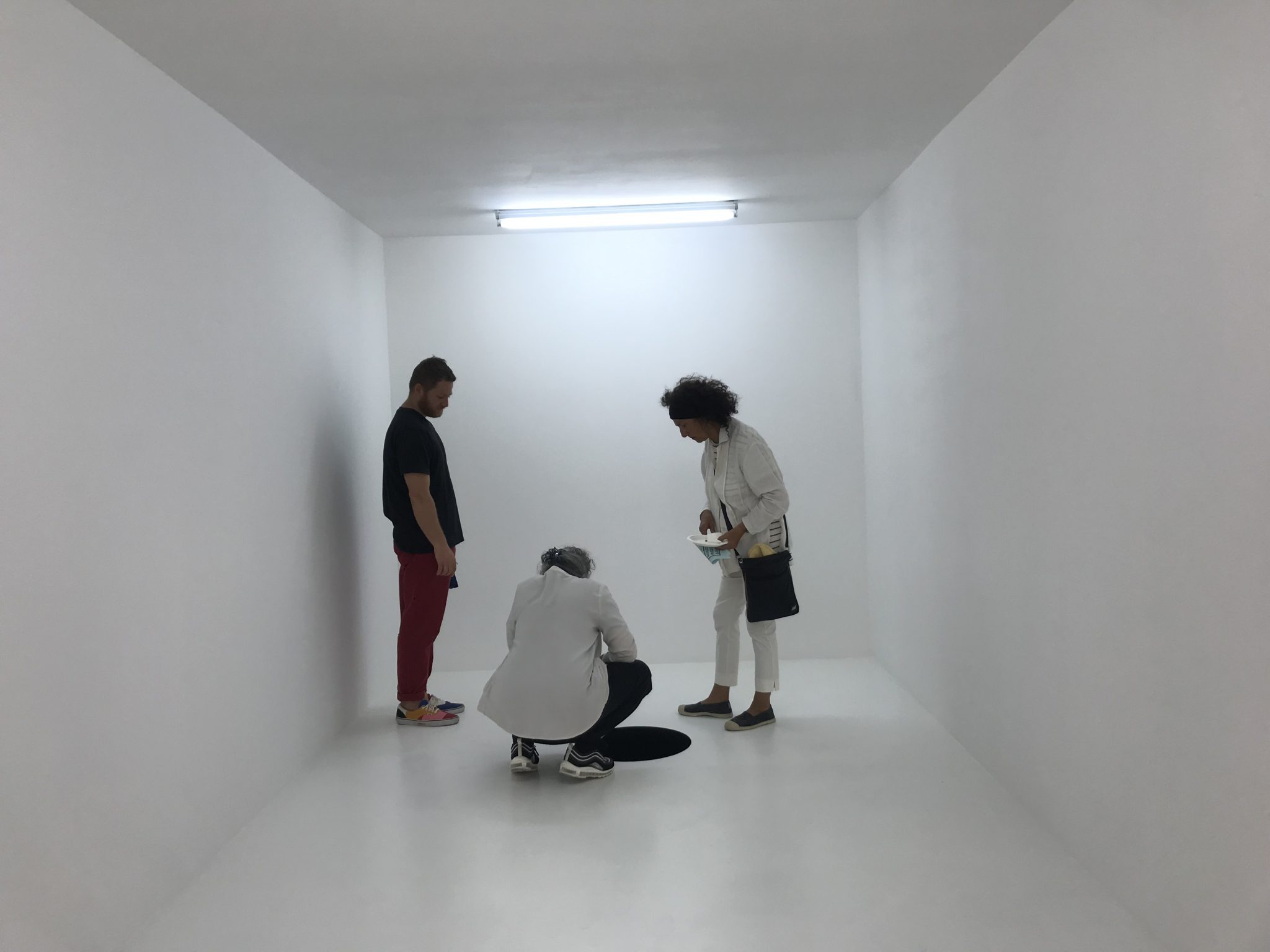 The current graduating class is the last to study in the building at 60 Salameh, soon to be turned into a residential project. Some of the students took advantage of the opportunity to make extreme changes in the space. For example, in Ouroboros, Lior Tamim drilled a hole between the second floor hosting the exhibition and the floor underneath, creating a kind of resonance box. Its vibrations reinforce the feeling of an impending apocalypse overtaking the white cube constructed around the black hole.