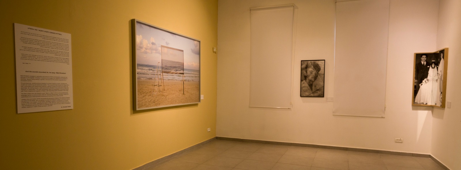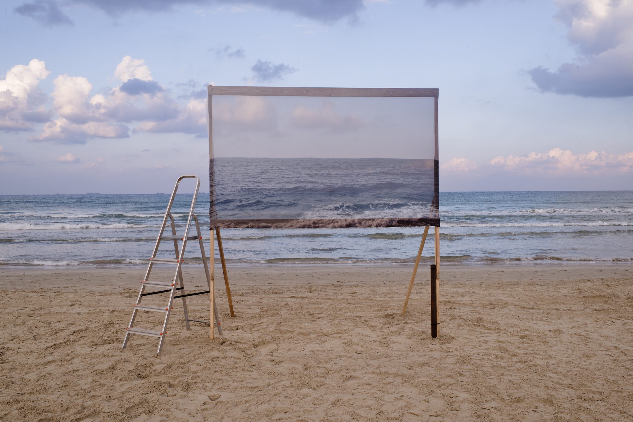The photographs in Mati Elmaliach’s exhibition, And the sounds (sounded) far, far away continue his visual research on replication and erasure. The large work in the exhibition, Untitled (Sea and ladder), documents an art action in which Elmaliach and his father placed a wooden frame on the Acre beach, imprinted with the image of the Safi beach in Morocco where the elder Elmaliach grew up. The image of the sea is doubled, and part of the actual sand is hidden; memory is present and fragile, held on thin wooden poles in an infinite present.