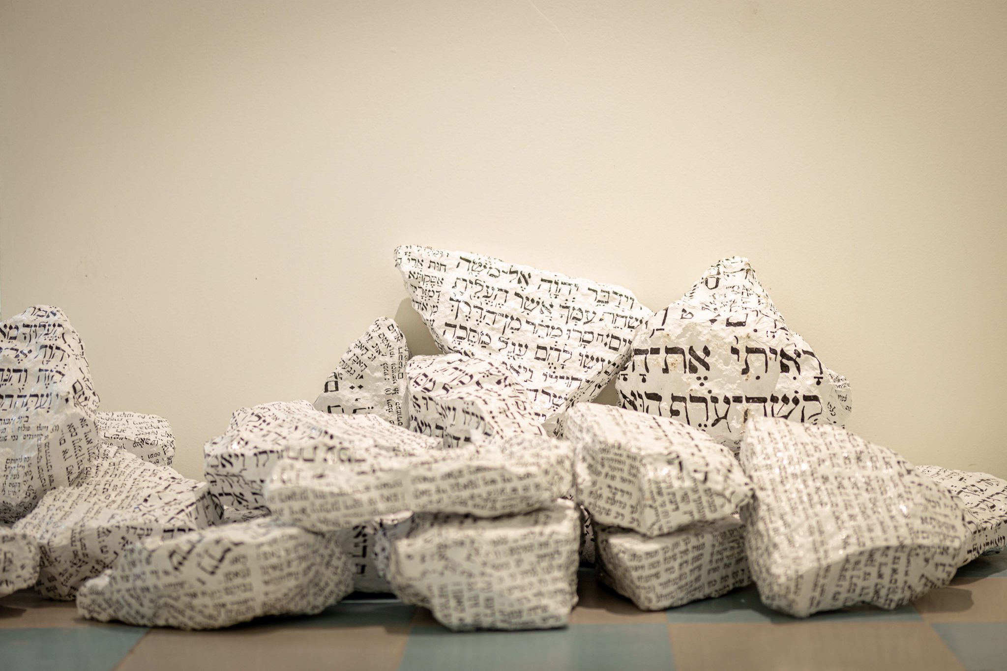 Stones marked with text create an image that weld together culture and violence. In the mixed-media installation, Like the First, Avner Sher refers to the dramatic moment when Moses smashes the Tablets of the Covenant after descending Mount Sinai and discovering that the Israelites are worshipping the Golden Calf. When forced to choose between the spiritual and the corporeal, the people turned to the corporeal, the base and the instantaneous. Sher repeatedly replicates the verses describing how God reports to Moses that the people have returned to idolatry. In contemporary imagery, stones symbolize violence, especially political violence, as well as execution by stoning and the Jewish custom of placing a stone on a grave to mark one’s visit.