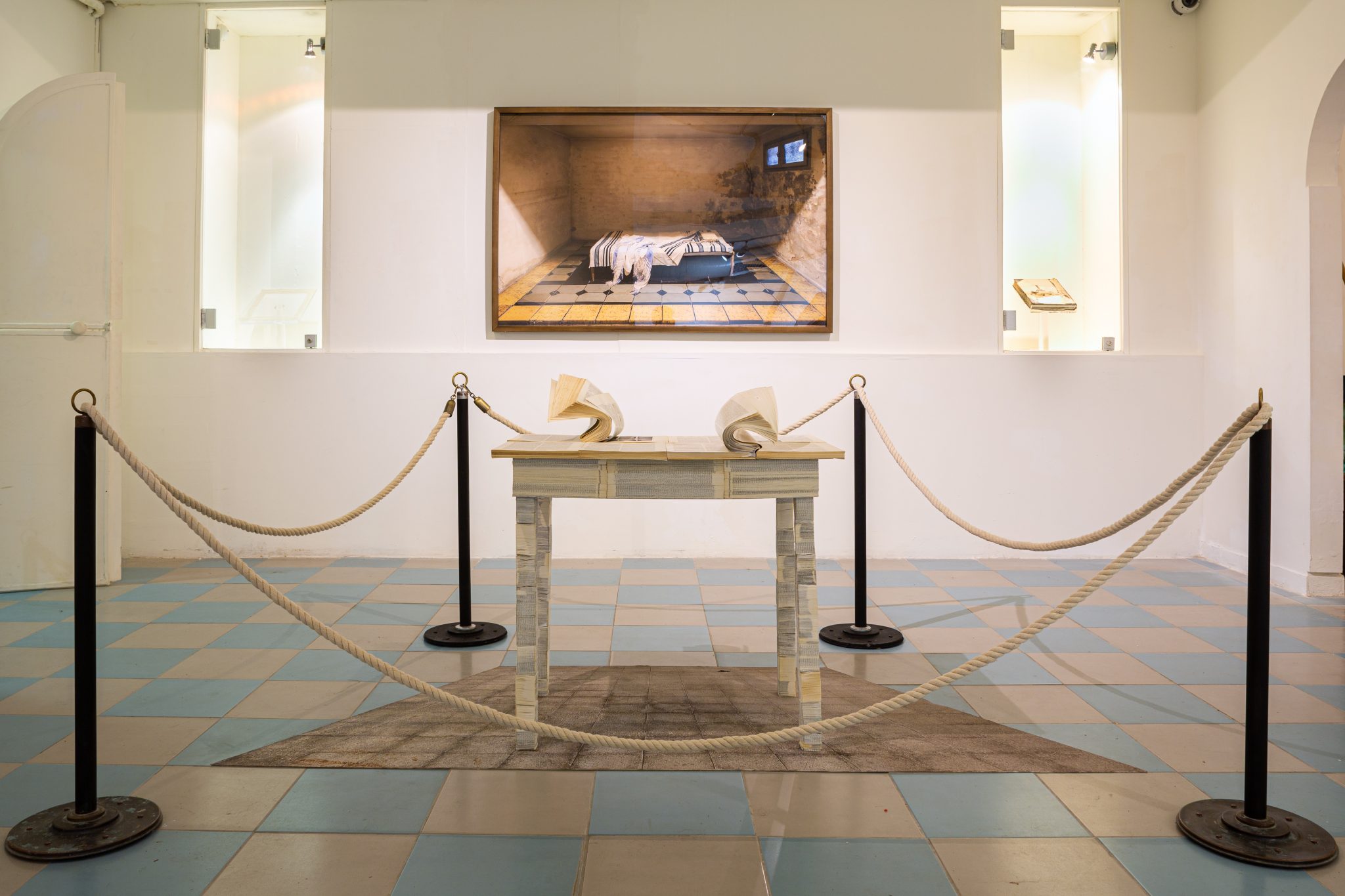 Friction between time and space, and objects and memory, becomes tangible in the installation by Pesi Girsch, Window and the Shadow of Books. Girsch created a three-dimensional installation consisting of volumes of the Encyclopedia Hebraica and photographs. The photographs were all shot in the same space and show books and furniture designed as a mise-en-scène, like frozen moments of beauty and pain seized from the passage of time. The encyclopedia echoes the failure of twofold optimism: the belief from the Age of Enlightenment that knowledge can be encompassed and that its foundations are unchanging; and the early days of the State of Israel, when the first Encyclopedia Hebraica was published and signified the culmination of general and Jewish culture. The now discarded volumes are transformed by Girsch into a material that signifies a meeting of personal memories, the longing for a specific time and a nostalgic past, and a crushed Modernism. The photographs of the encyclopedia alongside the volumes themselves create a physical encounter with written culture and books, an attentiveness and silence that have almost disappeared.