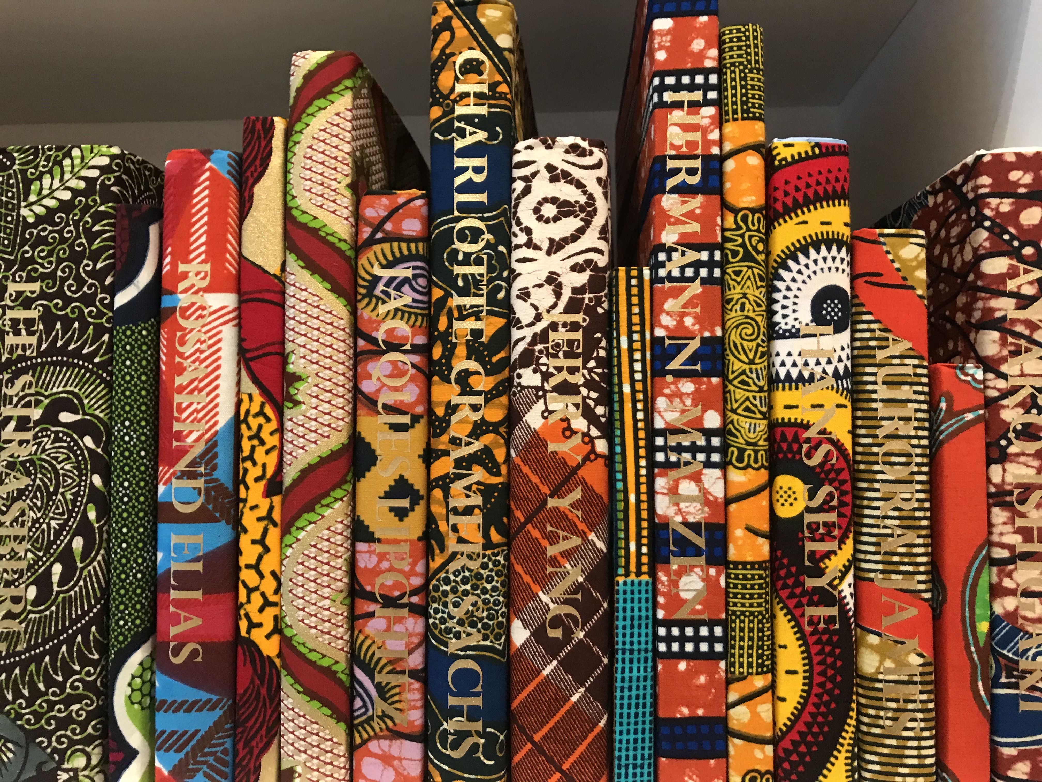 שונברי כרך את הספרים בבדים שהפכו לסימן ההיכר המזוהה שלו. במקור יוצרו בדים בהדפסי שעווה, באטיק, באינדונזיה. הקולוניאליסטים ההולנדים אימצו את הדגמים ויצרו גרסאות תעשייתיות שיוצרו בהולנד באנגליה ויוצאו לקולניות באפריקה, מעגל ניצול קפיטליסטי קולוניאלי אופייני למדי. בהיפוך אירוני הם הפכו בשנות ה 60 של המאה הקודמת לסימן גאווה בזהות האפריקאית הפוסט-קולוניאלית.