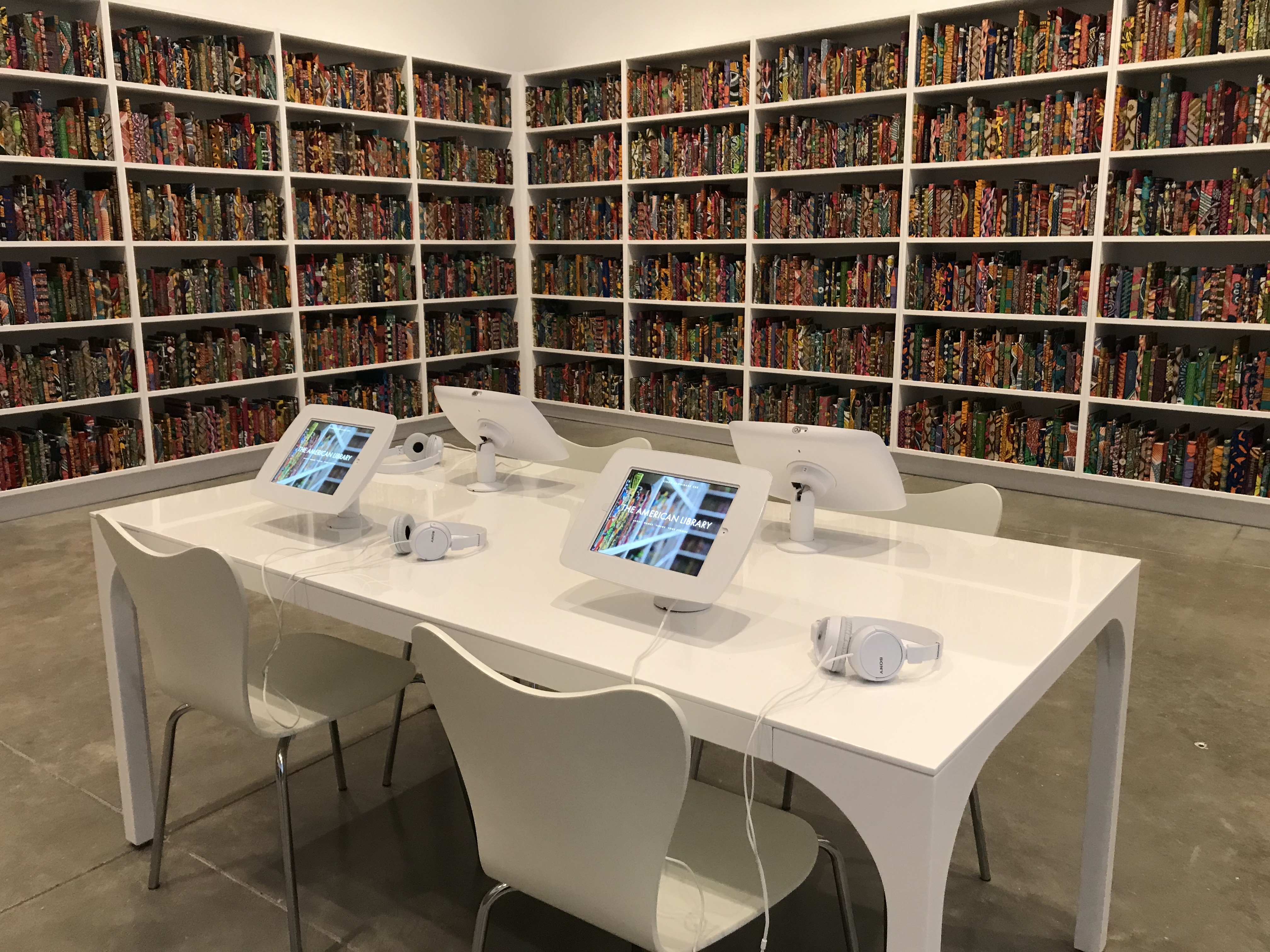 הספריה האמריקאית The American Library מיצב של ינקה שוניברי מ 2018 שהותאם ICA נועלת את התערוכה והיא אחת העבודות המרשימות ביותר שיצר בשנים האחרונות. העיסוק של שוניברי בקולוניאליזם ופוסט קולוניאליזם מתורגם כבר שנים לעבודות מרהיבות, לעיתים קרובות טורדות ונחרטות בזיכרון. כאן הוא יצר 6000 ספרים כרוכים בבדים צבעוניים אפריקאים-לכאורה כשעל שדרות הספרים , באותיות מוזהבות, מוטבע שם של אדם, מדור ראשון או דור שני של “ההגירה הגדולה” The Great Migration, ההגירה של כששה מיליון שחורים מדרום ארה”ב למזרח ומערב המדינה בין שנות העשרה של המאה הקודמת ועד לשנות ה 70. ההגירה, שמוגדרת היום יותר ויותר כמנוסה מטרור לבן, נבעה מהגזענות והאפליה גזעית הממוסדת ששבה והתבססה בדרום ארה”ב באותן שנים עד ההצלחה היחסית של התנועה לזכויות האזרח .