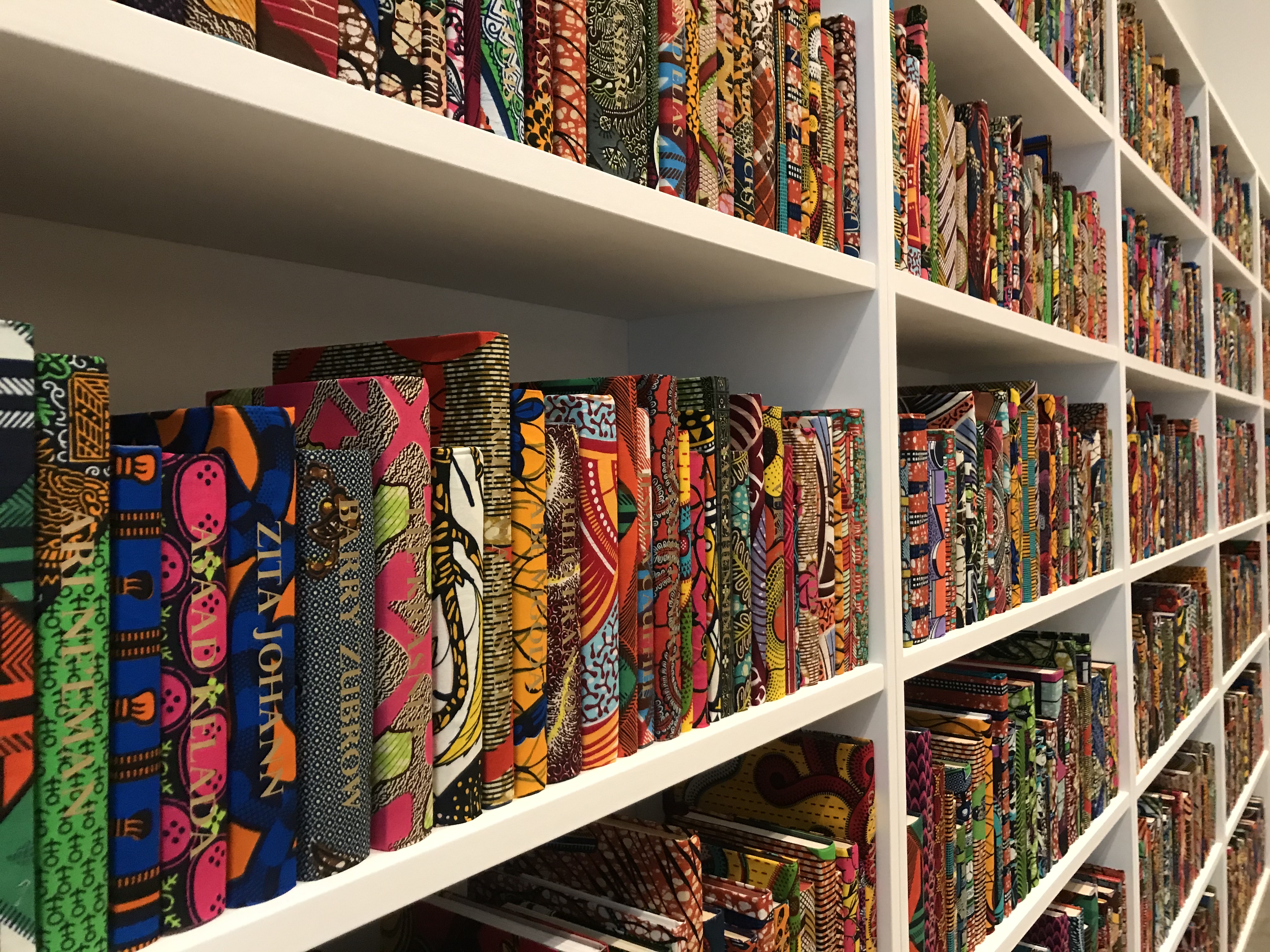 Shonibare bound the books in fabric that has become his signature. Patterns of this kind originated in Indonesian batik printing, and were then appropriated by Dutch colonialists who manufactured the textiles in Holland and England, and exported them to their colonies in Africa. This capitalist colonial cycle of exploitation was very typical. In an ironic twist, they became during the 1960s a sign of pride in post-colonial African identity.
