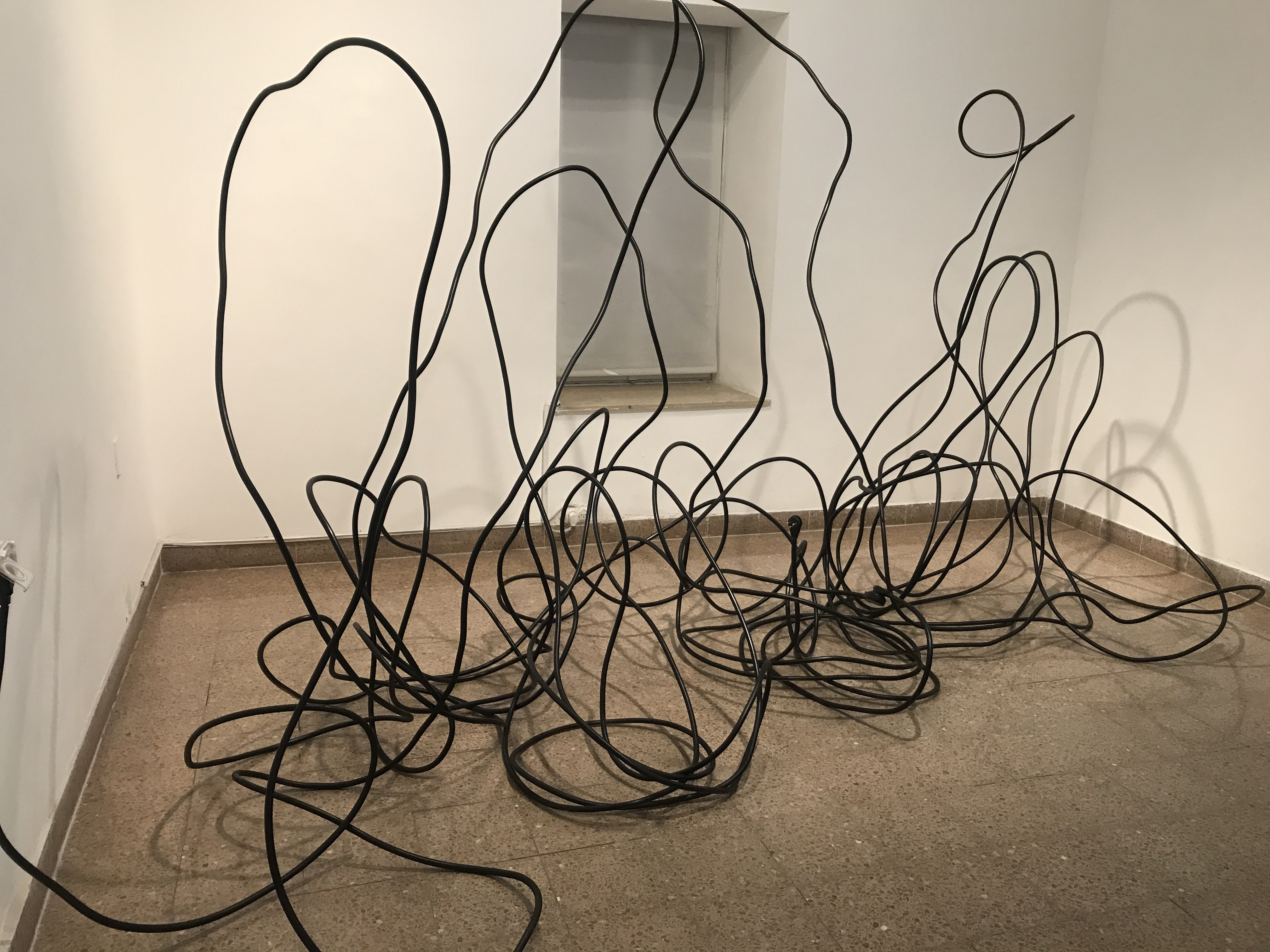 Enola Gay by Lihi Nidiz is comprised of electric cables forming a black line drawing in the space with movement and momentum. It carries a certain toxicity and irony due to its name – the American bomber that dropped the atom bomb (named “Little Boy”) on Hiroshima. The title was the name of the mother of one of the pilots, with horrifying sweetness.