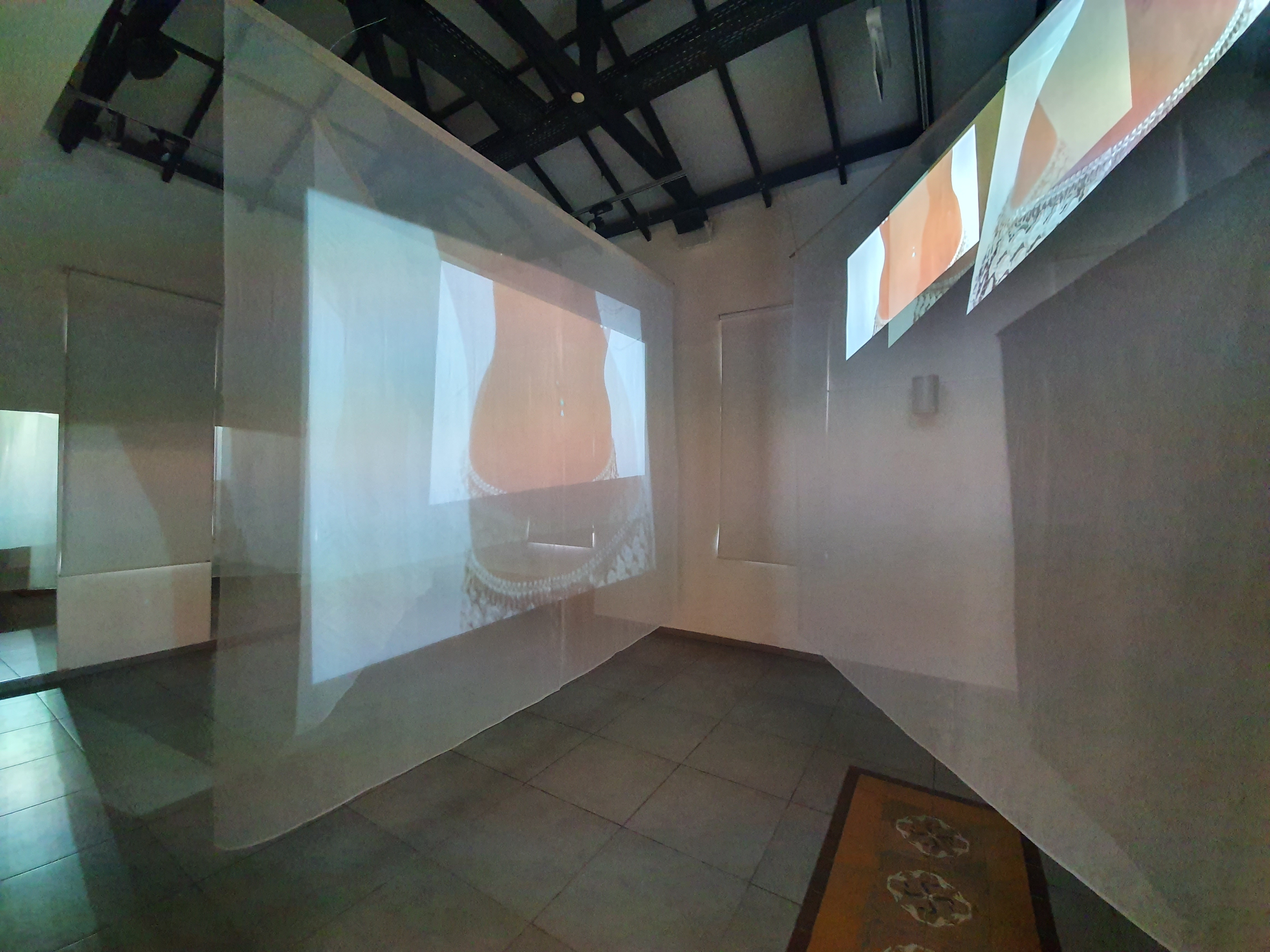 מיצב הוידיאו באלדה הוא חלל שכמו מתפרק ומתלכד: על ווילונות שקופים מוקרנת בטן רוקדת, טורסו מנותק. הווילונות יוצרים מסדרונות וניתן להתקרב – לגעת בדימוי. ההתקרבות לא תגלה יותר מהדמות. היא נותרת קרובה ומרוחקת ומידי פעם ימצאו עצמם הצופים המשתקפים במראה חולקים איתה את המקום הלא מוגדר בו היא נעה. היחס בין הגוף החלקי, הפנטום הנע, לבין גוף הצופים מחדד את המודעות לשאלת הממשי וההשלכה, למרחק בין נראה למדומיין. בין ההקשרים המעניינים עבודה של האמנית הטורקייה ניל יאלטר שיצרה ב 1974 את האישה ללא ראש או רקדנית הבטן. יאלטר צילמה עצמה כותבת על בטנה טקסט צרפתי העוסק במילת נשים וזזה למוסיקת ריקוד, וכך דנה בחופש נשי וסטראוטיפים דכאניים. קרבה מסוימת יש לBarbed Hula (2000), של סיגלית לנדאו בו היא מסובבת סביב מותניה העירומות חישוק תיל הפוצע את הבשר החשוף. בעבודה של סמירה הבטן הנשית, כלואה בגבולות הכפויים של הדימוי וסובבת סביב צירה. לנדאו ערכה את הפעולה שלה בחוף הים, הגבול הטבעי של ישראל, והתייחסה כך לגבולות פגיעות ומעגלי זמן.