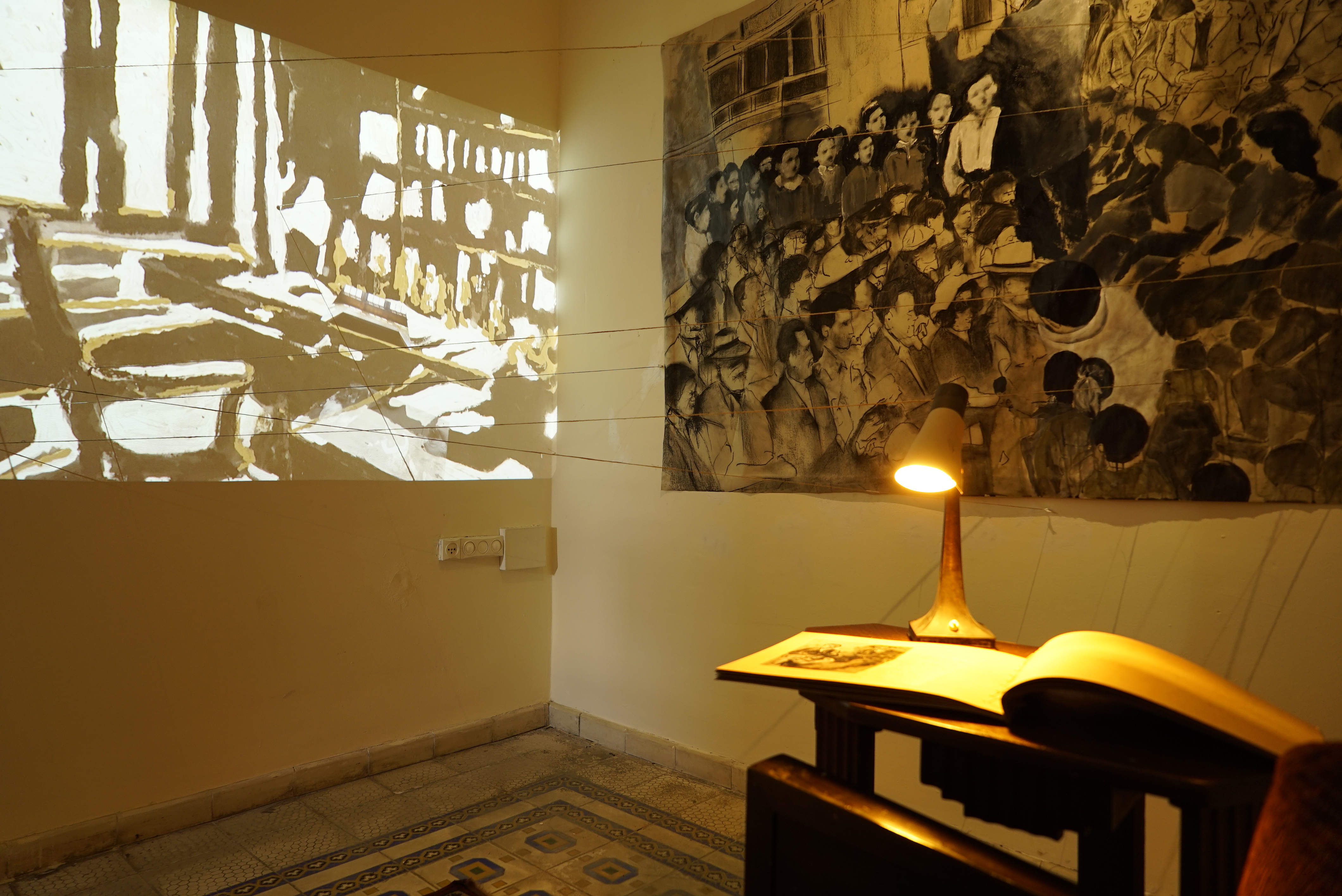 בין הקרנת הווידיאו לקיר הניצב לו ,ועליו הציור “הרגע שלא צולם”, מתוחים חוטים–קורים כמו נימי דם בין הפרטי לציבורי, בין חדר עבודה, עריסה אידאלית ליצירה כתובה (“חדר משלך” של ורג’יניה וולף מהדהד) לבין זירה פומבית לחשיבה ולימוד.