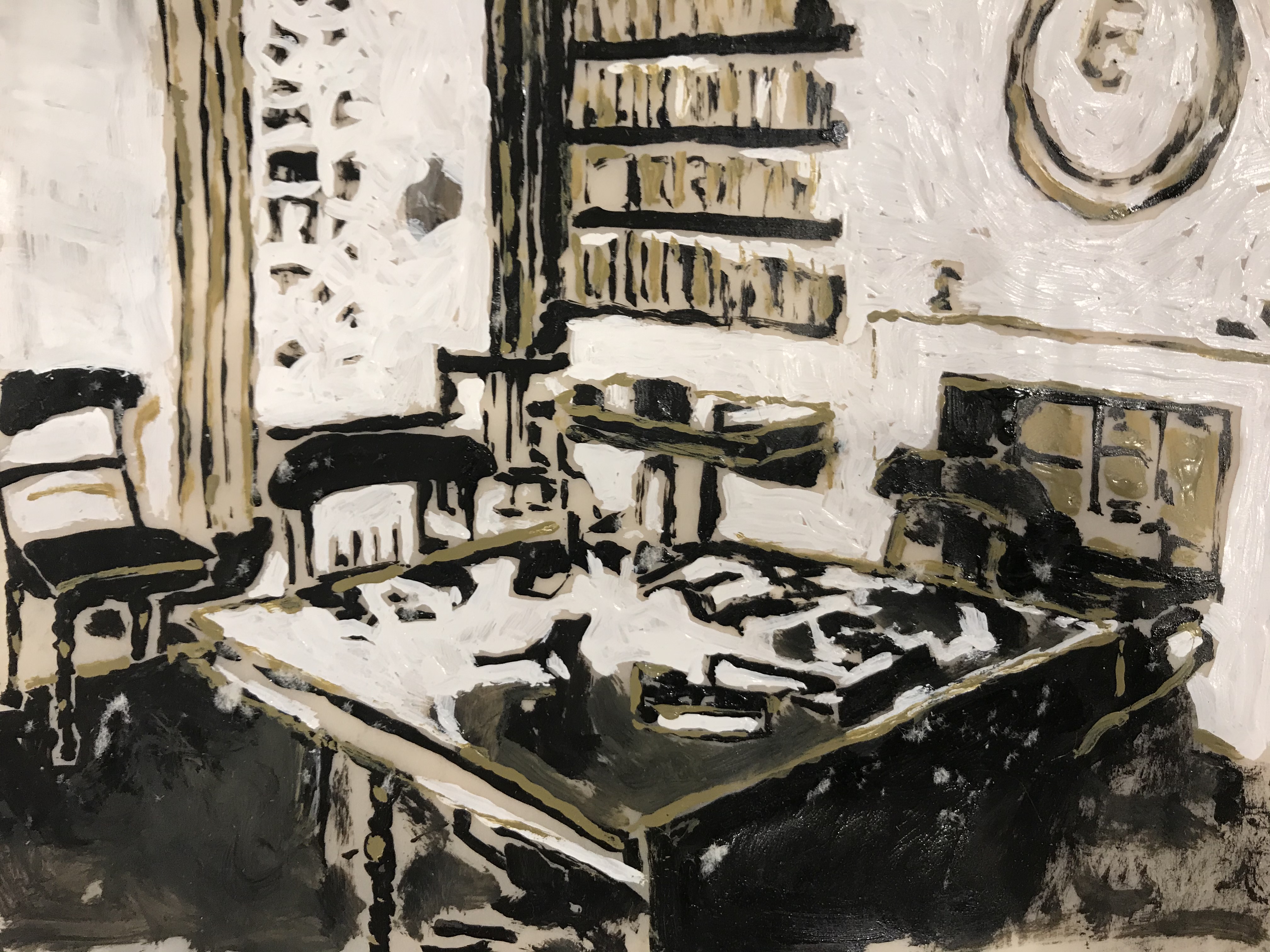 From inside the space, visitors can view the video Workspace (2019) which portrays paintings of writing spaces, including Bialik’s study, merging with imaginary spaces. Writing is perceived as an act of self-determination and spiritual reflection, sometimes as an act of resistance. Within each painted space in the film is an opening through which one can see a clip filmed from inside the Bialik House, acting as a hidden layer beating like a secret heart, perhaps a realm of desire and hope. These images filmed in the Bialik House create a link between the imagined and the concrete, connecting eras, extracting the images out of our timeline, in a transition from present to past.