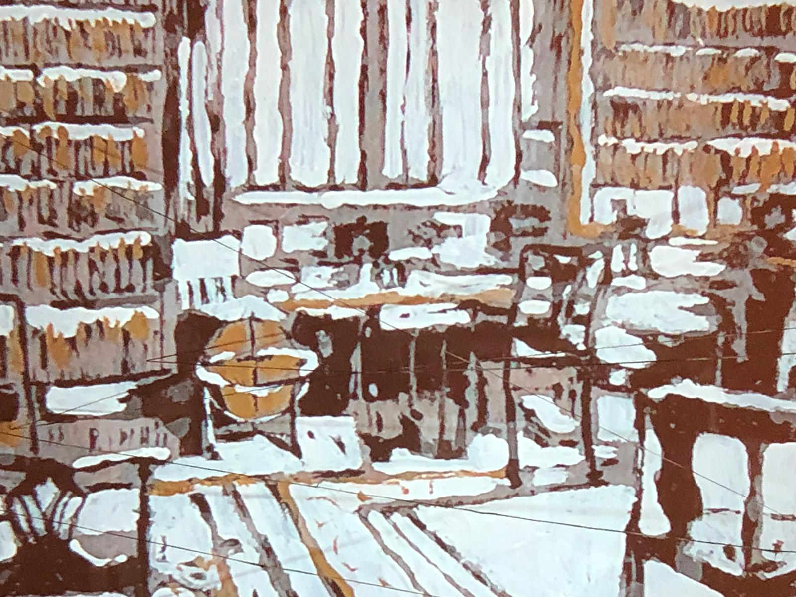 Photography was forbidden at the Oneg Shabbat meetings, deferring to Orthodox observance (although writing was permitted). In the painting The moment not photographed (2019), Navon makes present the Ohel Shem auditorium and its audience as a collage based on figures from various sources. She combines images of writers such as Yosef Aricha, Yakov Fichman, and David Shimonovitch (Shimoni) with the Ohel Shem choir and the audience photographed outside of the hall.