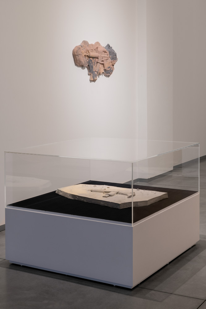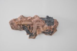 Three casts of guns looking like fossils, titled with the name of the gun followed by R.I.P. (rest in peace) are no less simplistic than the video. Turning the present into the past, similar to what Damien Hirst did in his exhibition Treasures from the Wreck of the Unbelievable (2017), they remain hollow, a sterile exercise in thought.