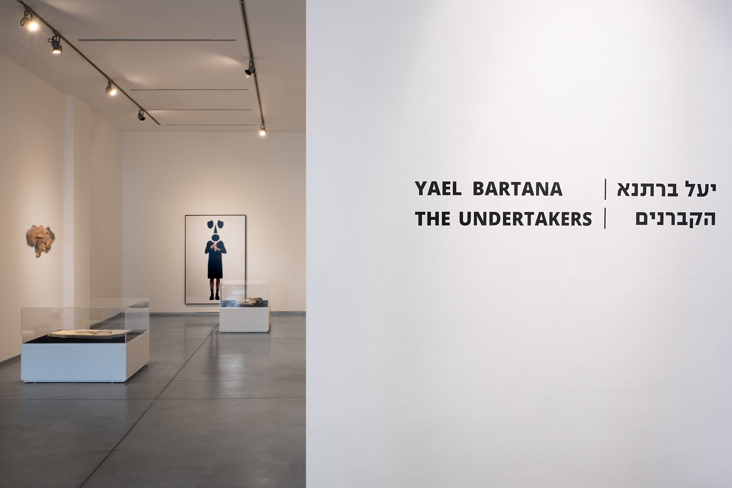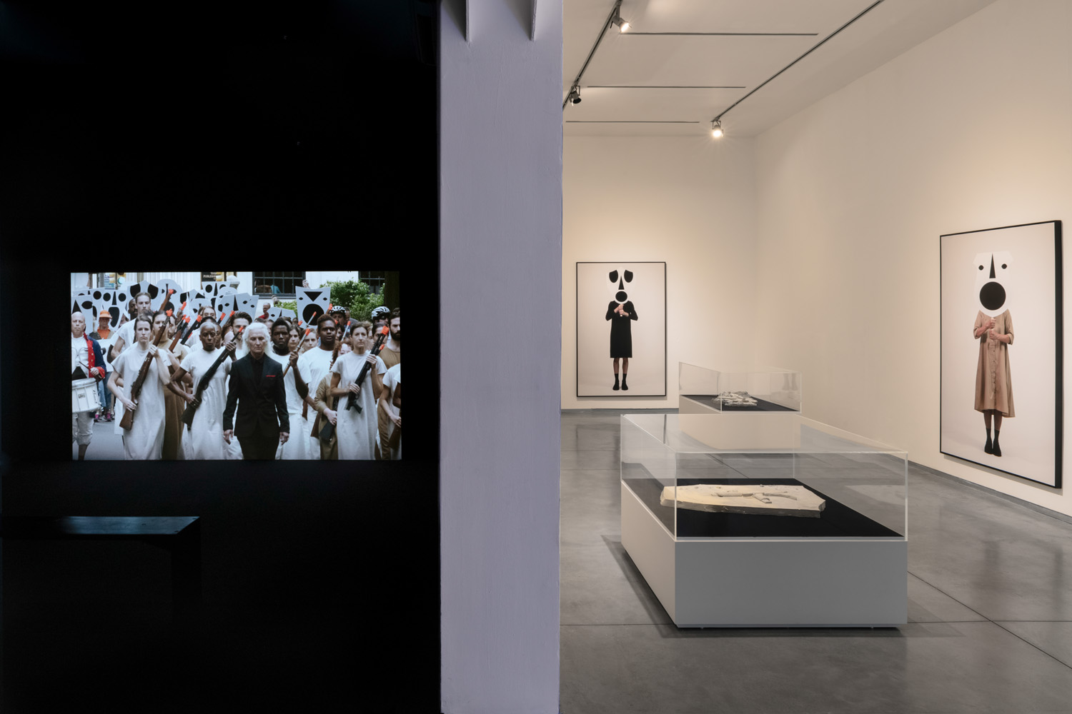 The three excellent photographs of undertakers stand alone perfectly. Bartana photographed figures in the simple fabric dresses holding large black and white masks hiding their face and neck. The graphics are reminiscent of radiation warning labels, or ancient cultures, and bring up associations with the masks worn by members of the Anonymous group. The photographs are almost life-size, with no pathos but with a feeling of ritual or menace, with some degree of self-awareness. They are extracted from our immediate reality, but the combination of resonating art of primordial cultures, hackers, and the danger of nuclear radiation along with heartrending humanistic innocence of the masks held so openly does convey what the 13-minute video did not express about power, violence, and pain.