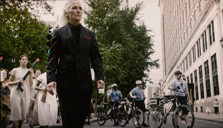 In Bartana’s video, the procession is led by a slender, elderly white woman (well preserving the current hierarchy), dressed elegantly in black. She has long white hair, presenting a hybrid of Marianne (image of the French Revolution) and the Angel of Death according to Bergner. The parade itself, with its noble figures and uniformly simple dresses, with a precise racial mix, also looks like a hybrid of influences processed in too raw a manner: Wonder Woman meets the Handmaid, or “Public Movement” with Alvin Ailey’s Dance Theatre.